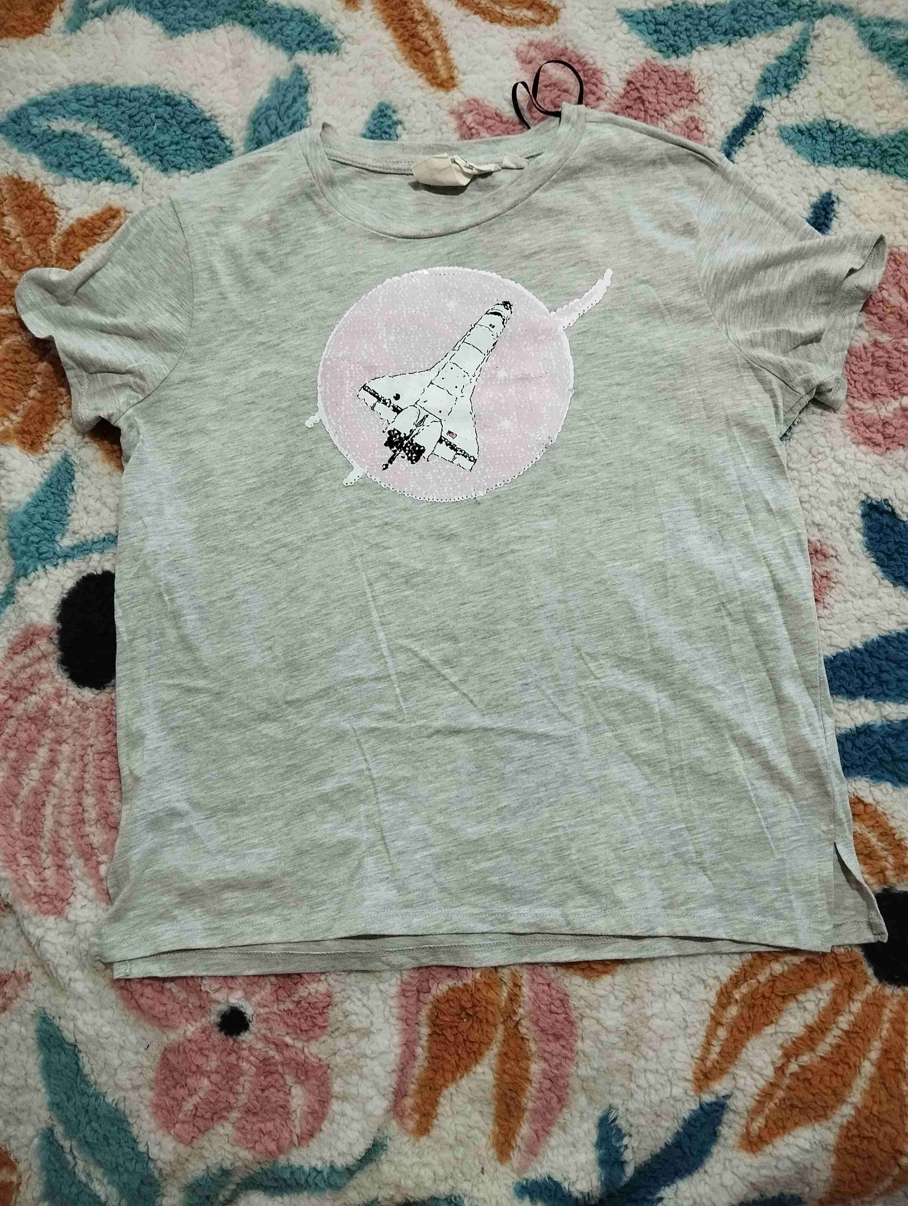 Polera gris de algodón con diseño de "cohete" con lentejuelas y al deslizarse es de "nasa", en buen estado. Ideal para uso casual diario.largo total 57cm cintura ancho hombros 40cm ancho axilas 49