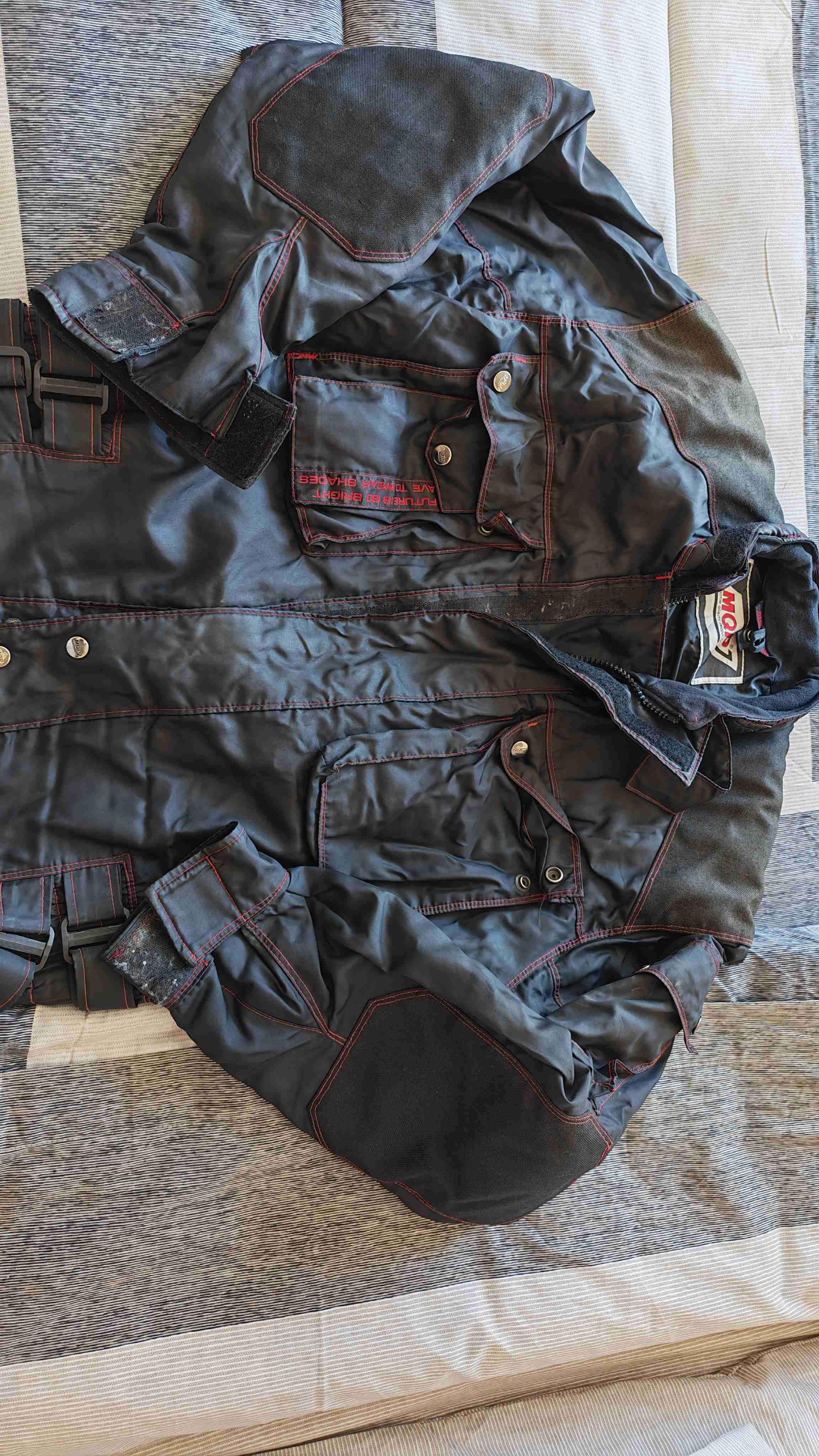 Chaqueta de moto negra con detalles rojos, ideal para protección en viajes. En buen estado, con signos leves de uso.