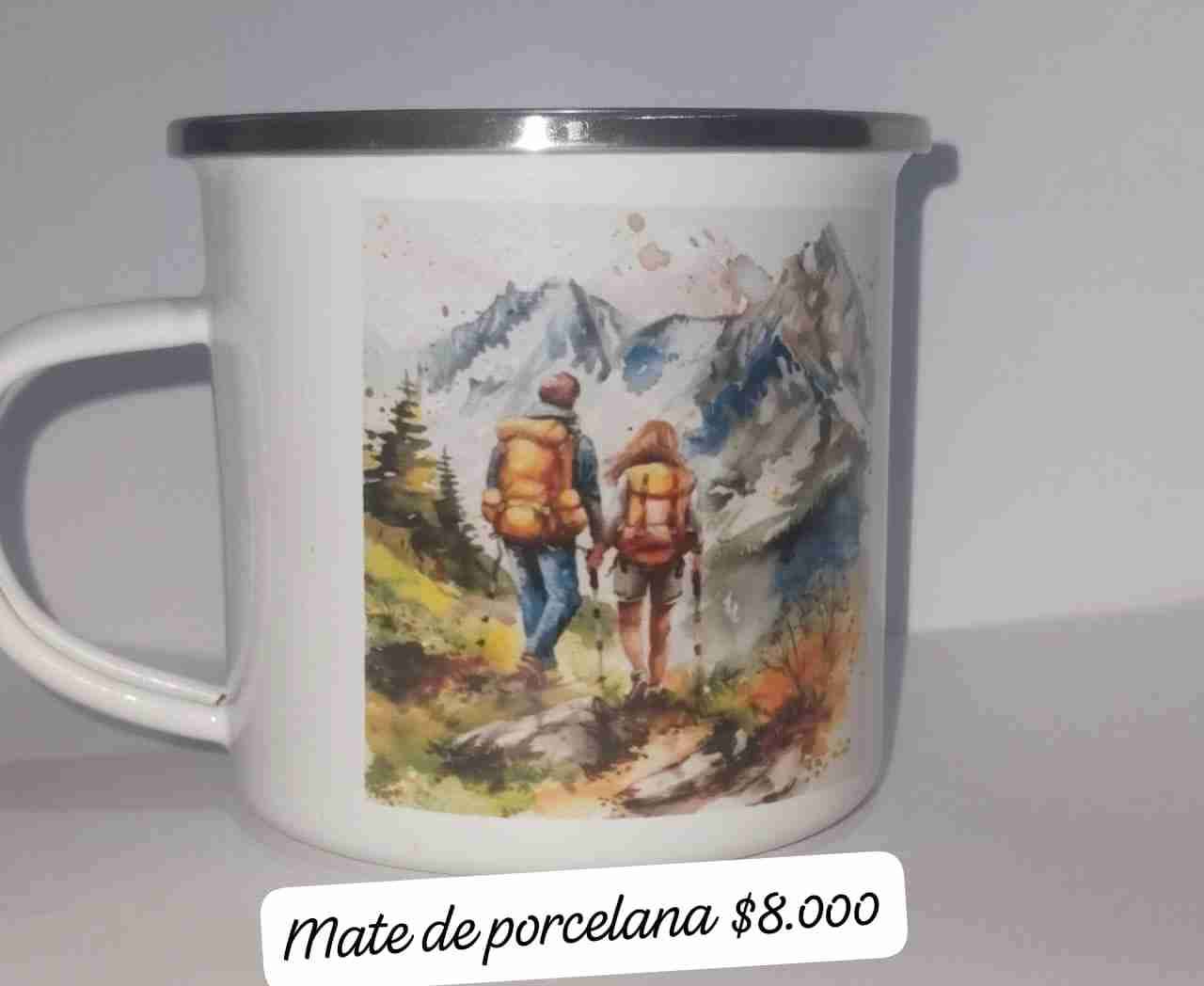 Taza de porcelana con ilustración de montañas y mochileros. Ideal para disfrutar de una bebida caliente.