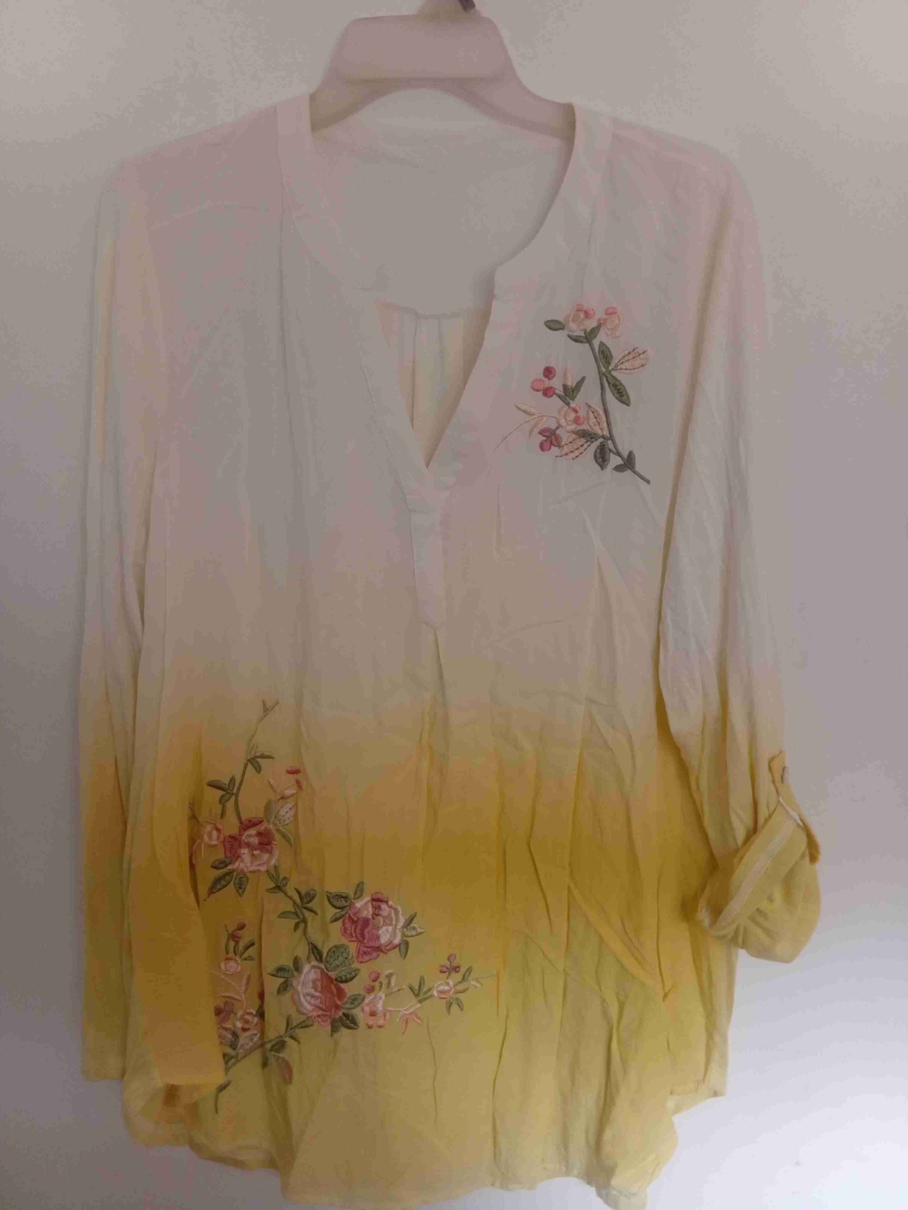 Blusa de mujer en tonos amarillo con diseño floral bordado, perfecta para un look primaveral. En buen estado.