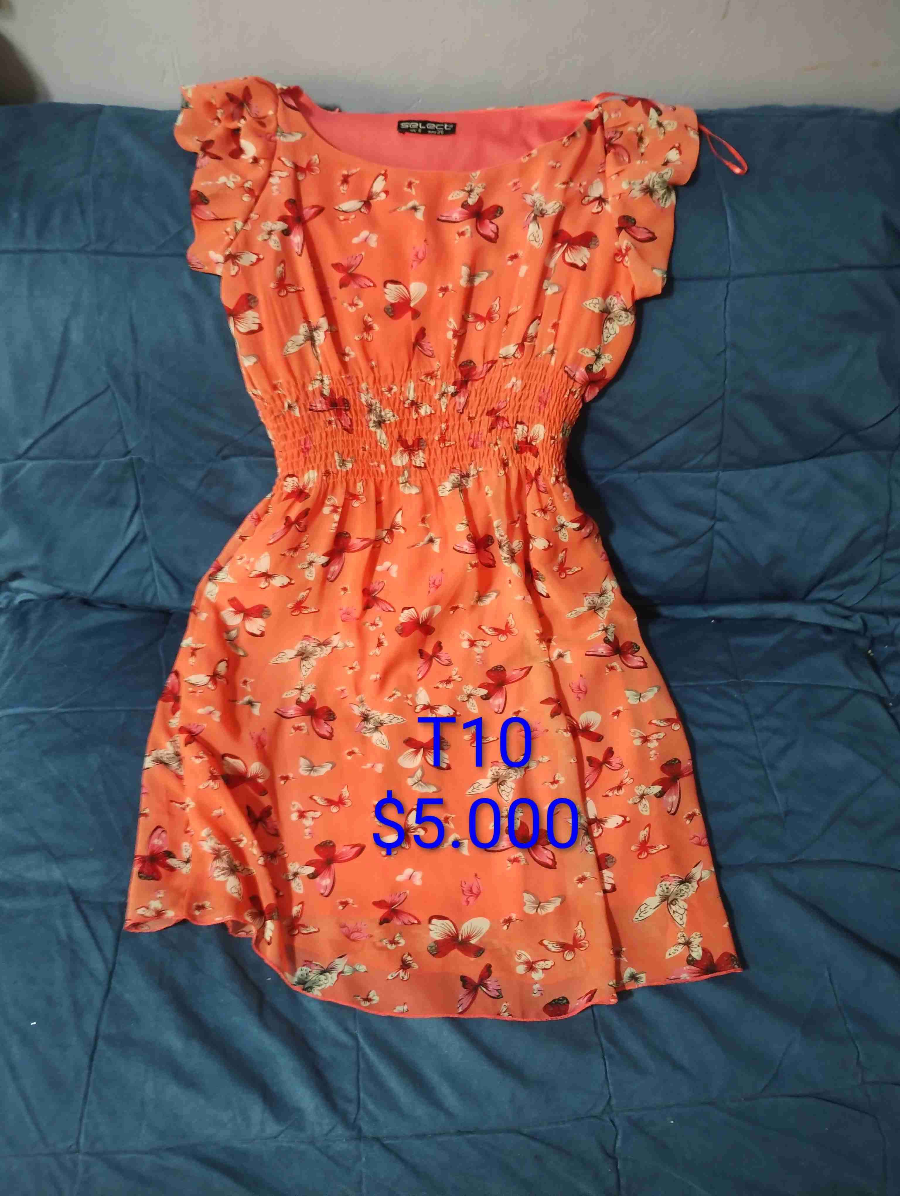 Vestido veraniego color naranja con estampado de mariposas. En buen estado con mangas rizadas, ideal para salidas casuales.