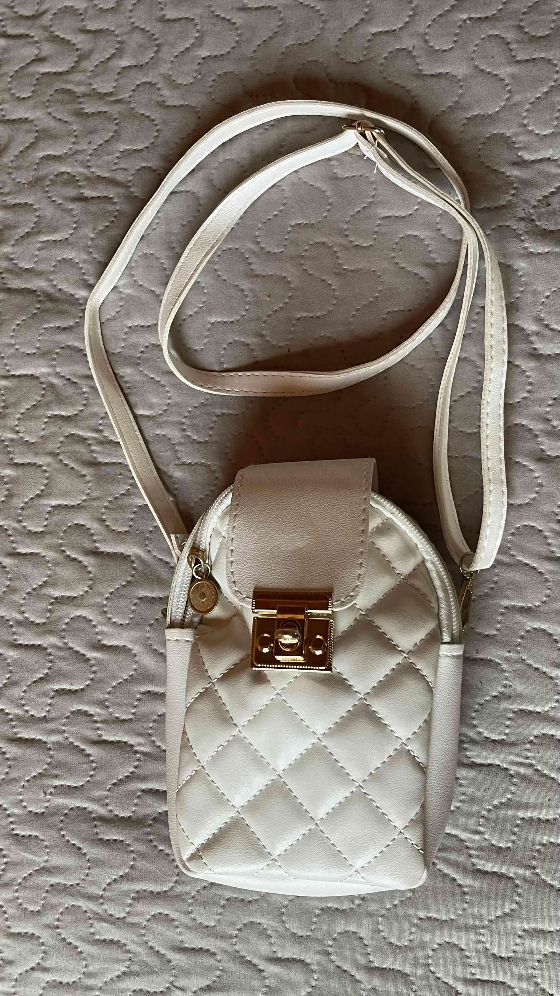 Cartera acolchada blanca en buen estado, perfecta para salidas casuales. Detalle de cierre dorado.