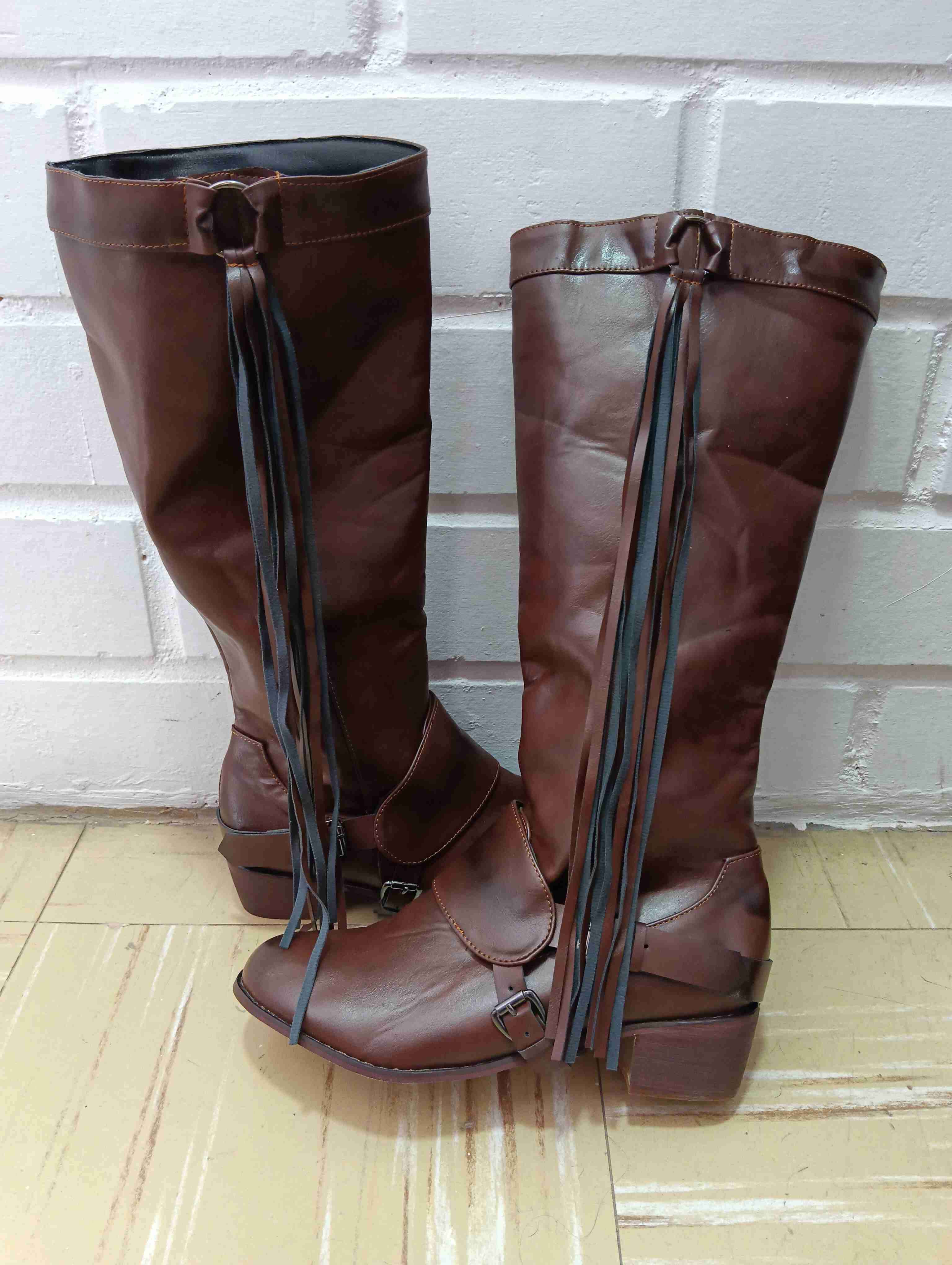 Elegantes botas altas de cuero marrón con detalles de flecos y hebillas. En buen estado, ideal para atuendos casuales y formales. Completamente nuevas