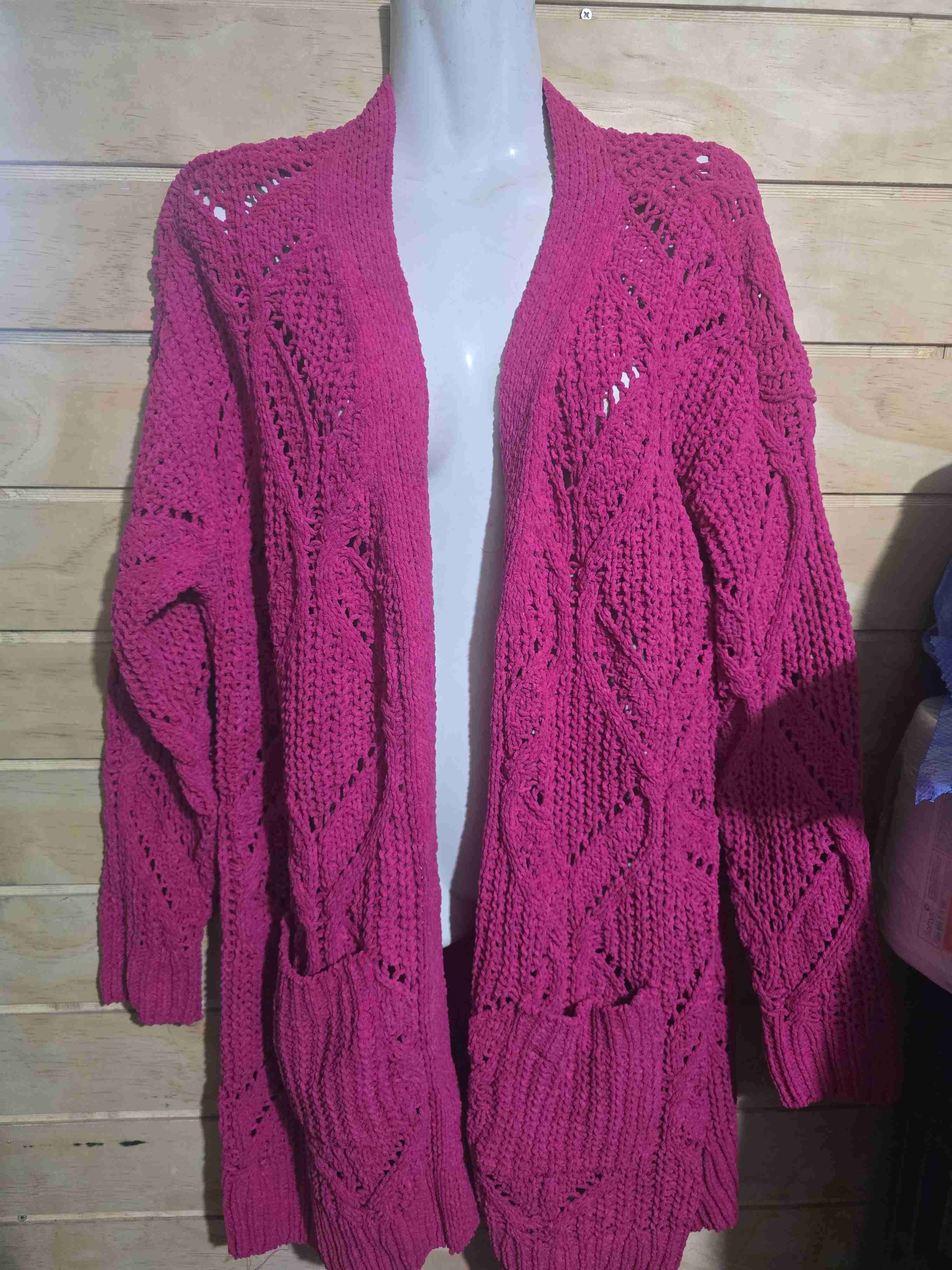 Cardigan abierto tejido a crochet en color fucsia. Perfecto para estilo casual. Buen estado.