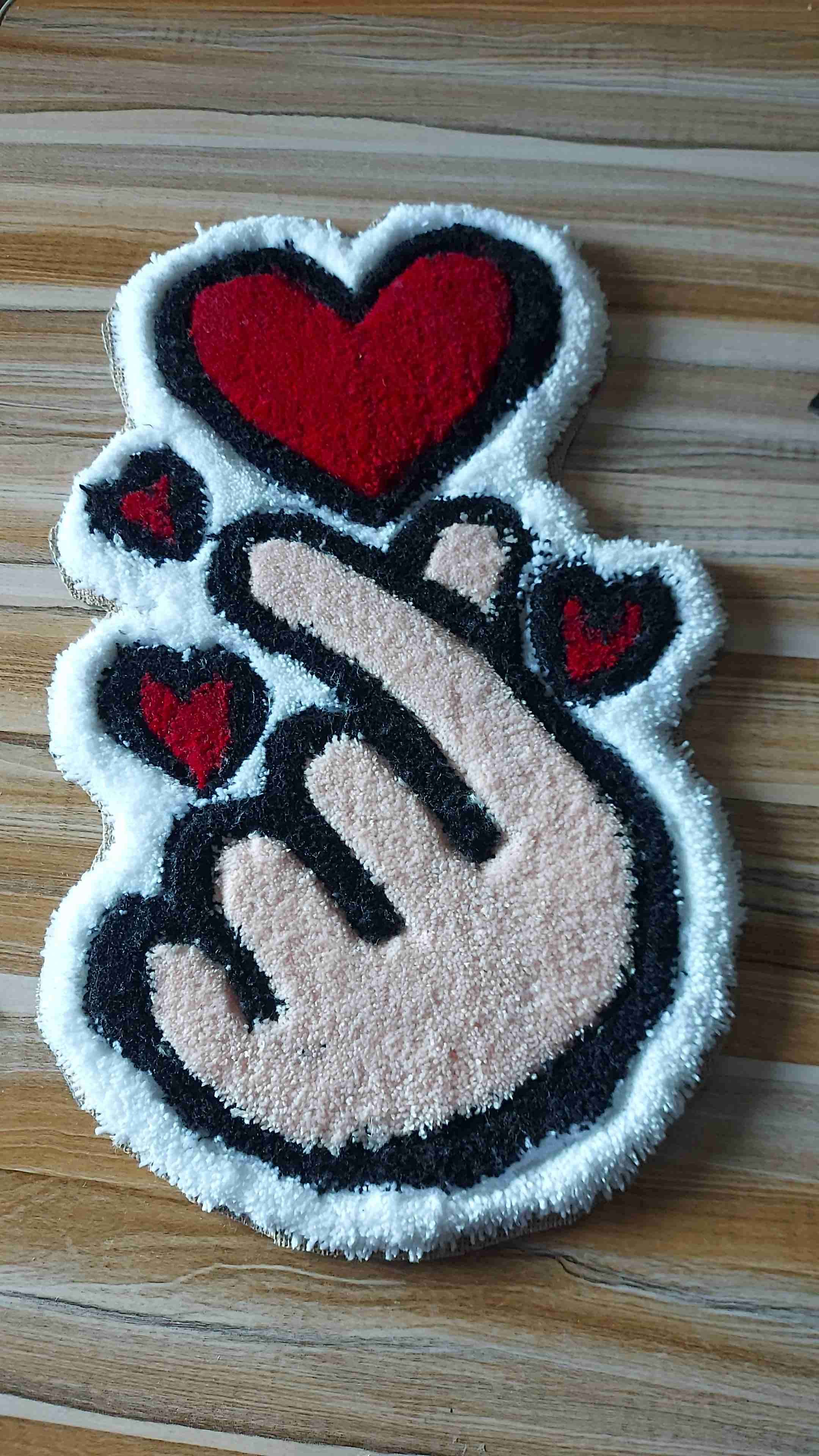 Pequeña alfombra decorativa con diseño de mano y corazones. Ideal para añadir un toque de amor a cualquier espacio. En buen estado.