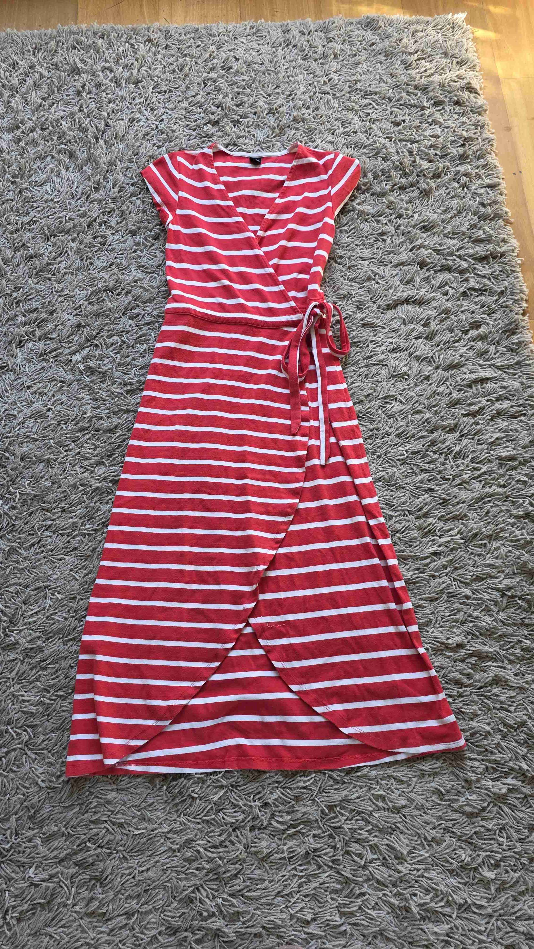 Vestido envolvente rayado en rojo y blanco. Ideal para el verano, en buen estado con leves signos de uso.