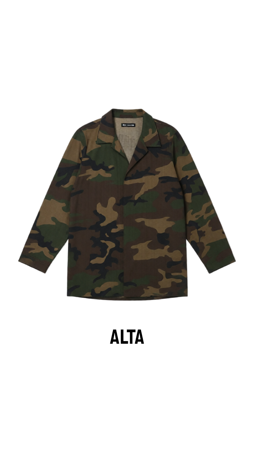 Chaqueta liviana o sobre camisa con diseño militar en tonos verdes. Ideal para un look casual y urbano. De tope (sin botones ni cierre) Da hasta una talla M