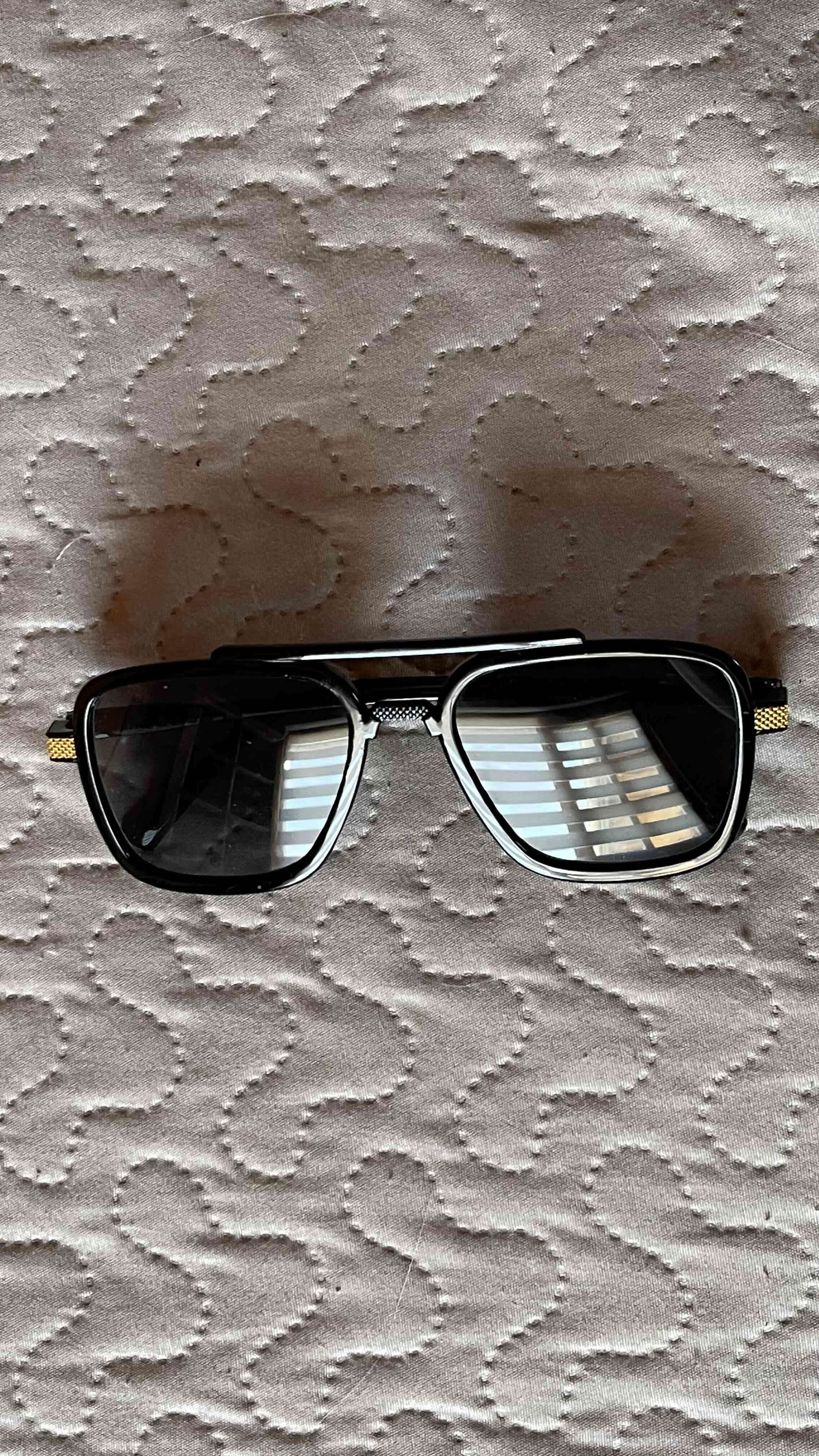 Gafas de sol negras con diseño moderno y detalles en dorado. Ideales para uso diario.