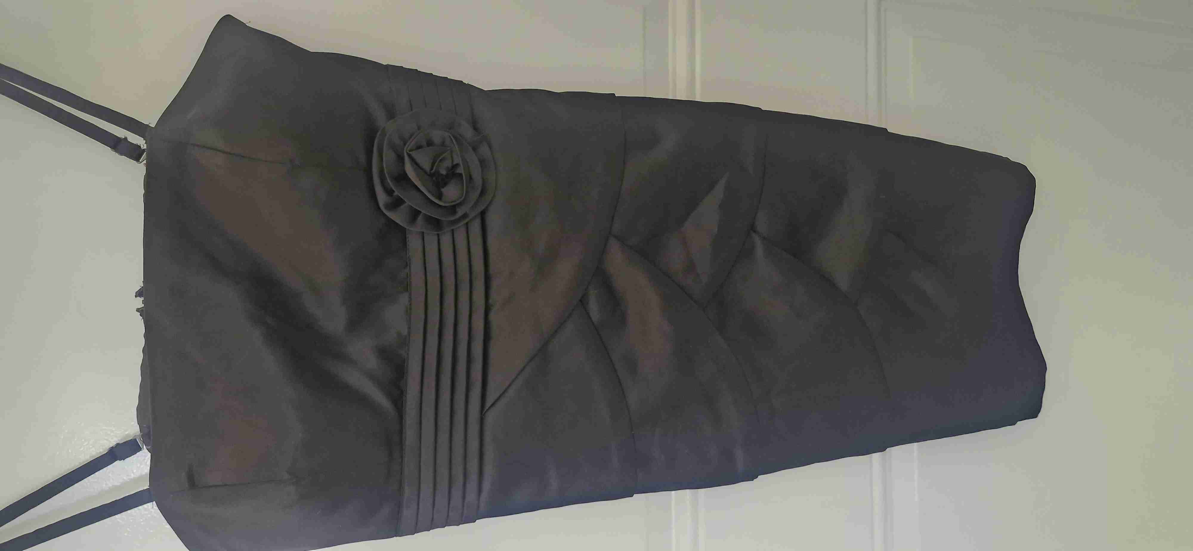 Elegante vestido negro con detalle de flor en la cintura. Ideal para ocasiones formales.