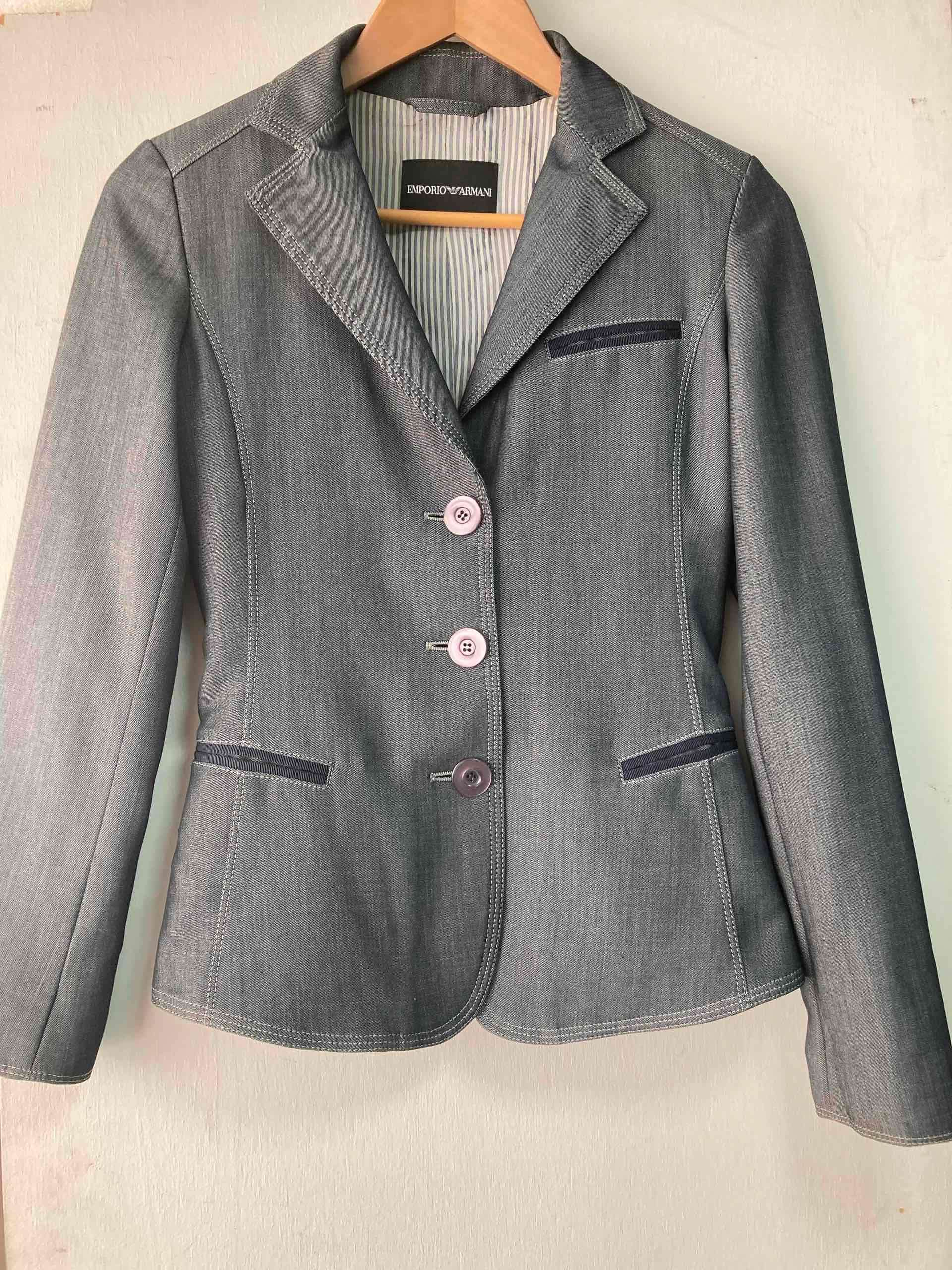 Elegante blazer gris de Emporio Armani, ideal para un look formal. En buen estado, presenta detalles en los botones y costuras. Úsalo para una reunión o evento especial.