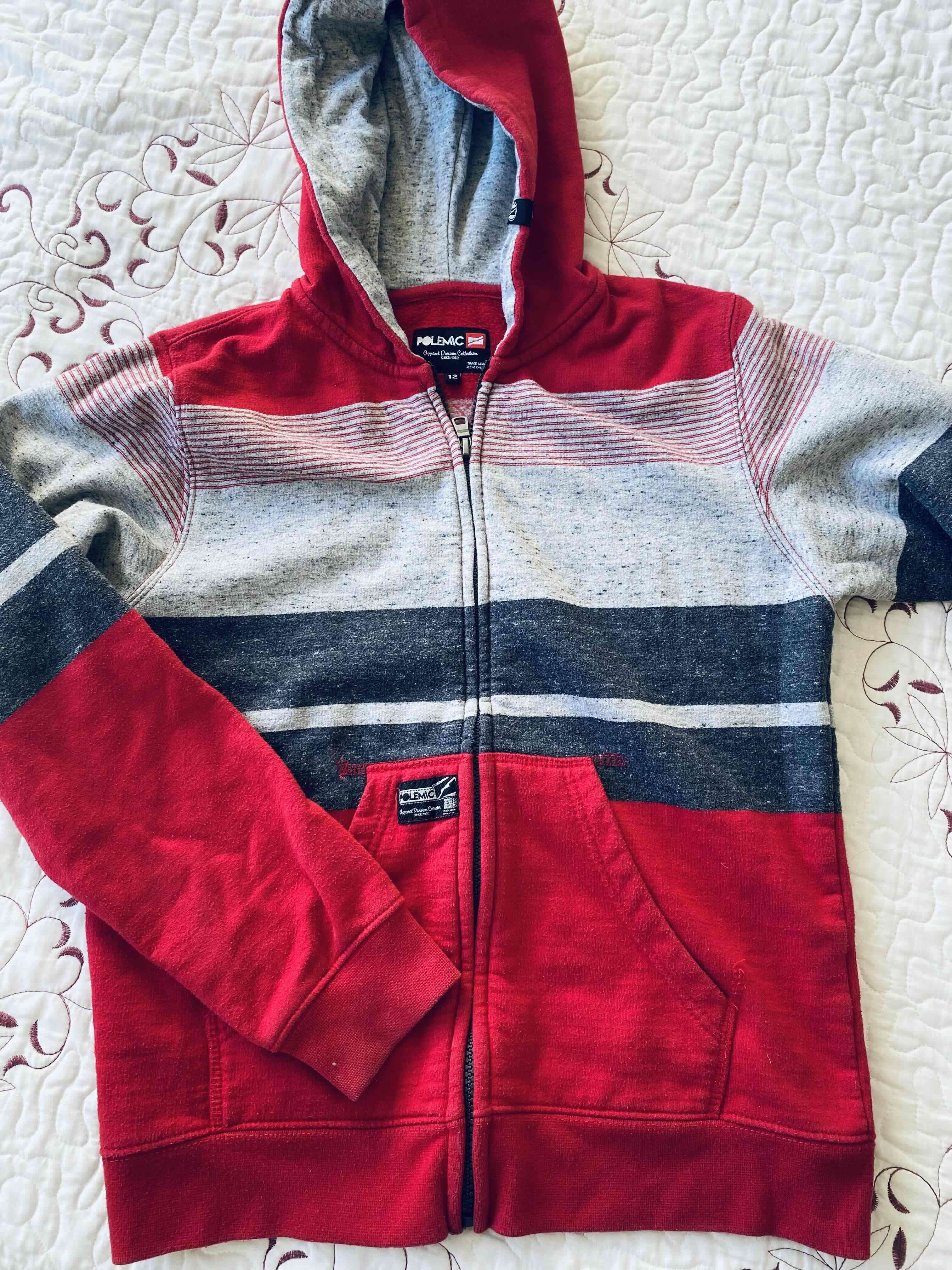 Polerón a rayas rojo y gris con capucha, cierre frontal. Ideal para días frescos, en buen estado general. Talla 12 marca polemic
