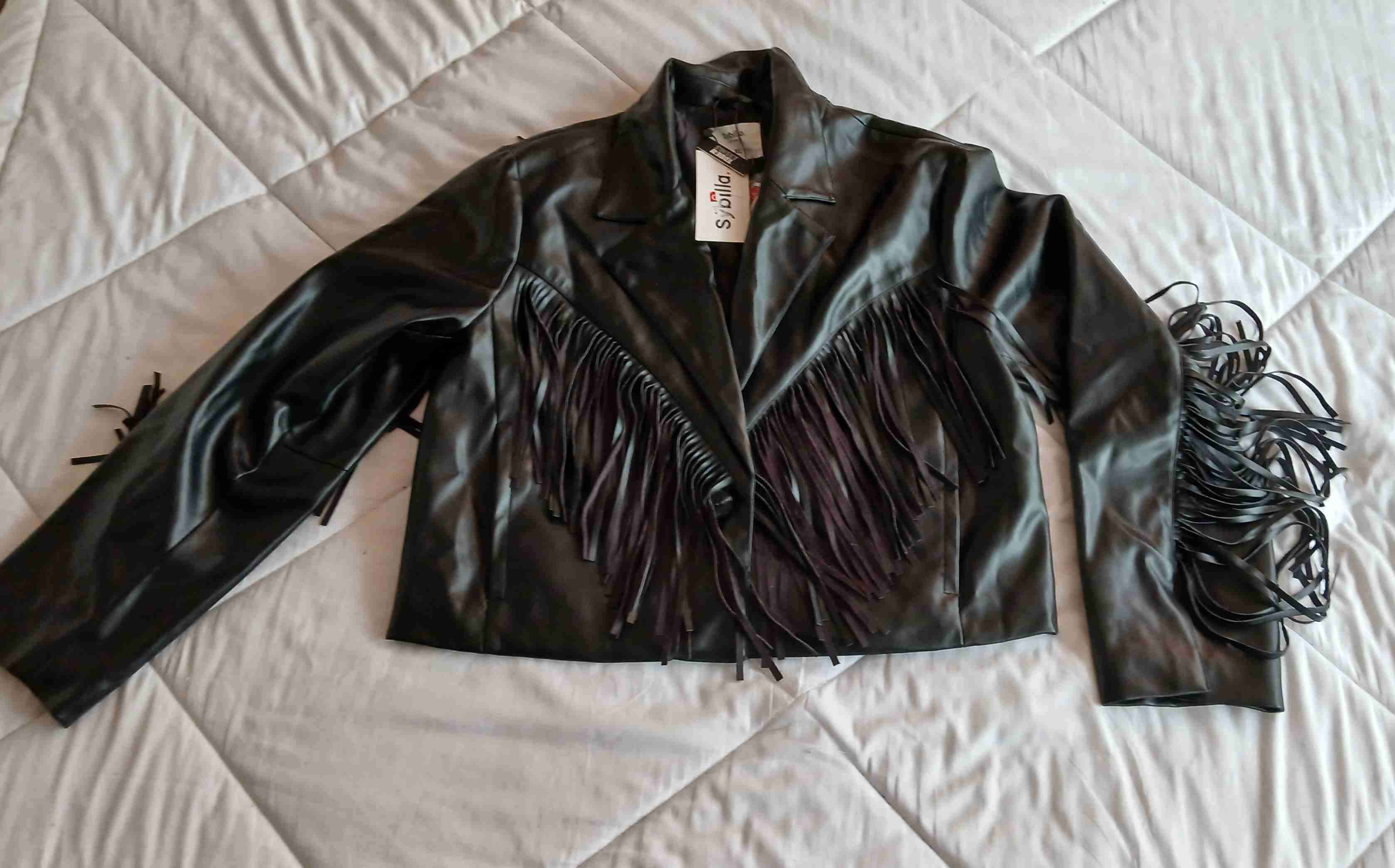 Chaqueta negra con diseño de flecos, ideal para salir. En excelente estado, nueva.