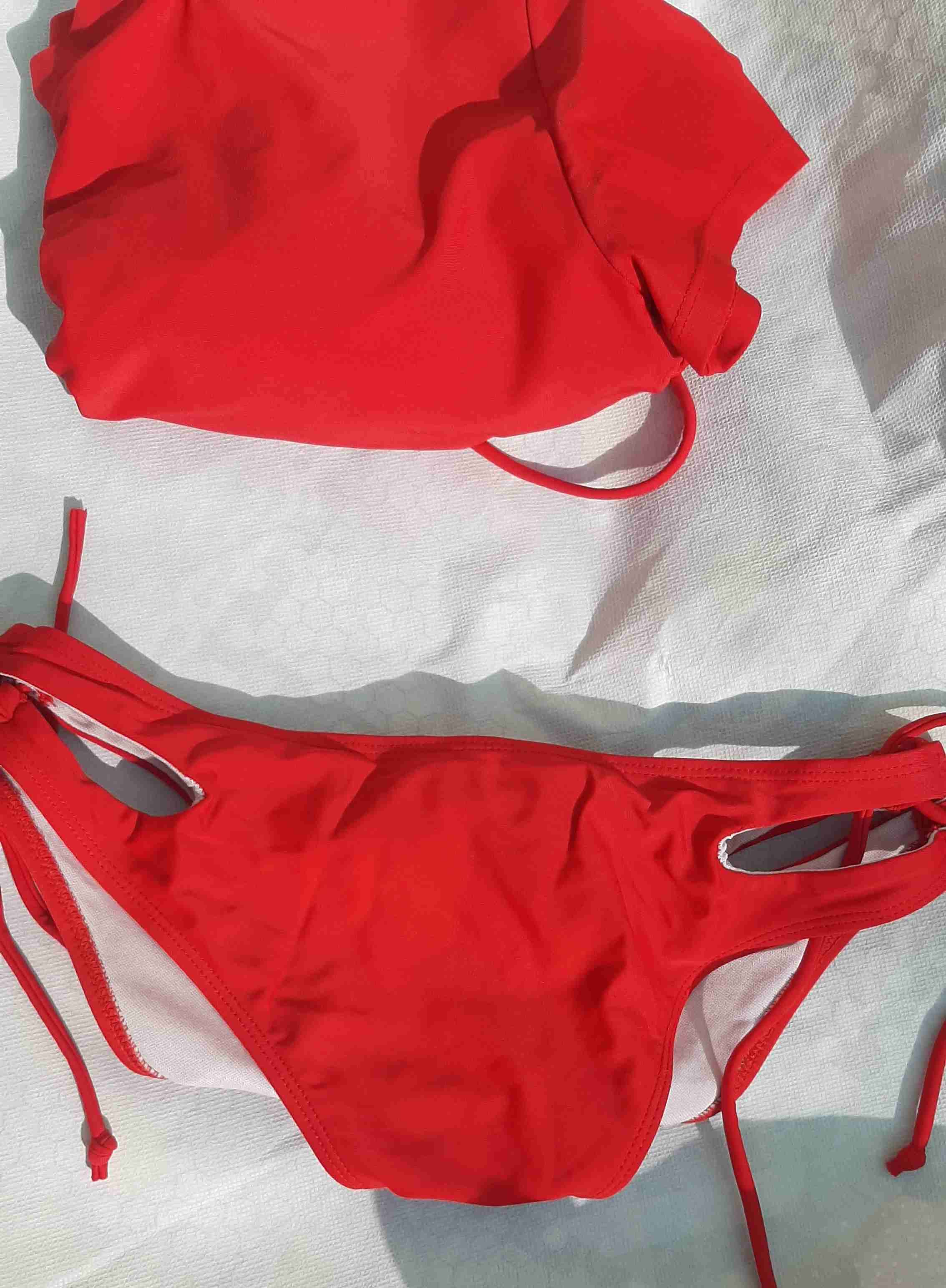 Bikini de dos piezas en color rojo vibrante con lazos ajustables. Perfecto para verano.