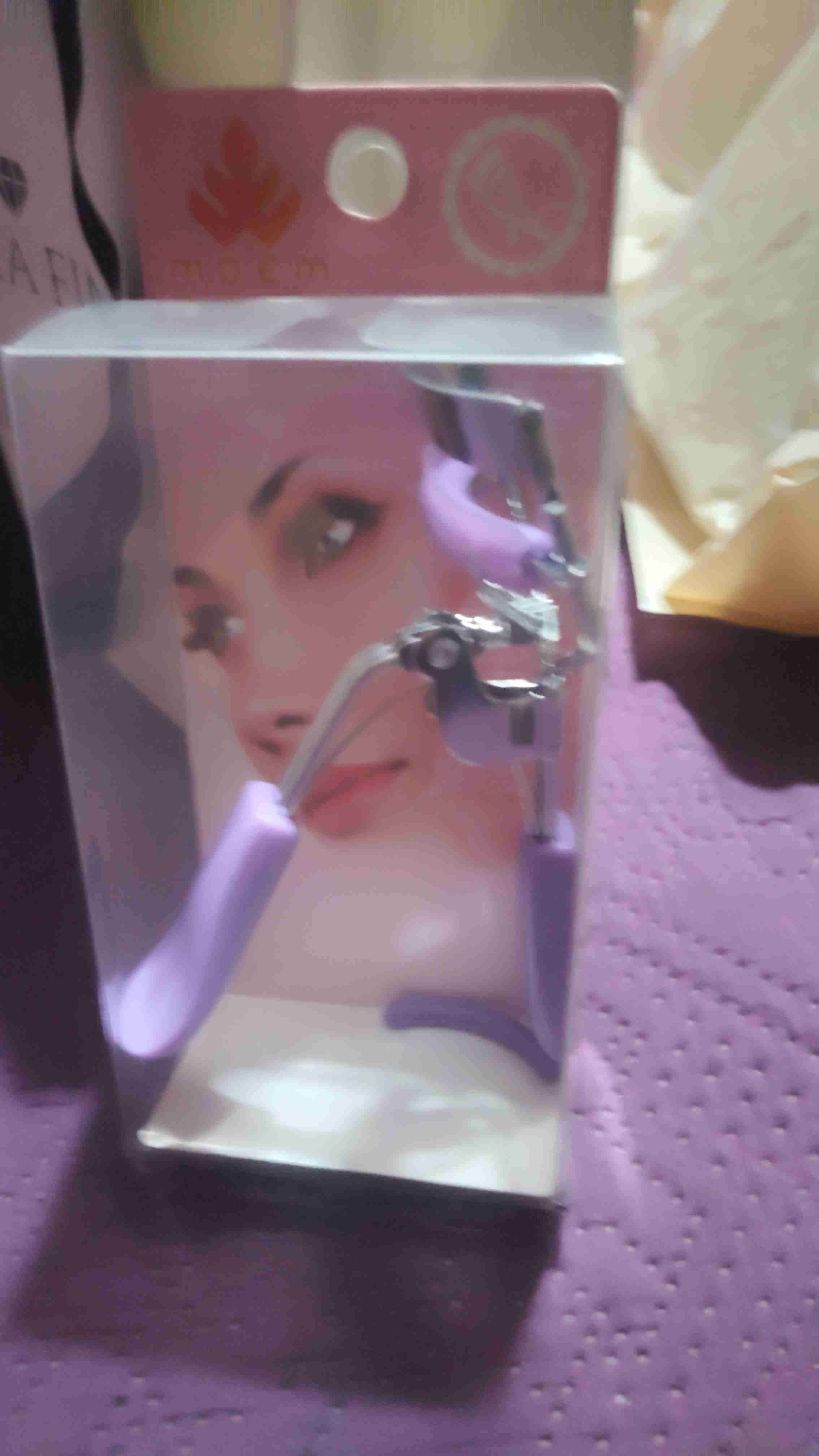 Rizador de pestañas con mango morado, ideal para un maquillaje perfecto. Producto en buen estado.