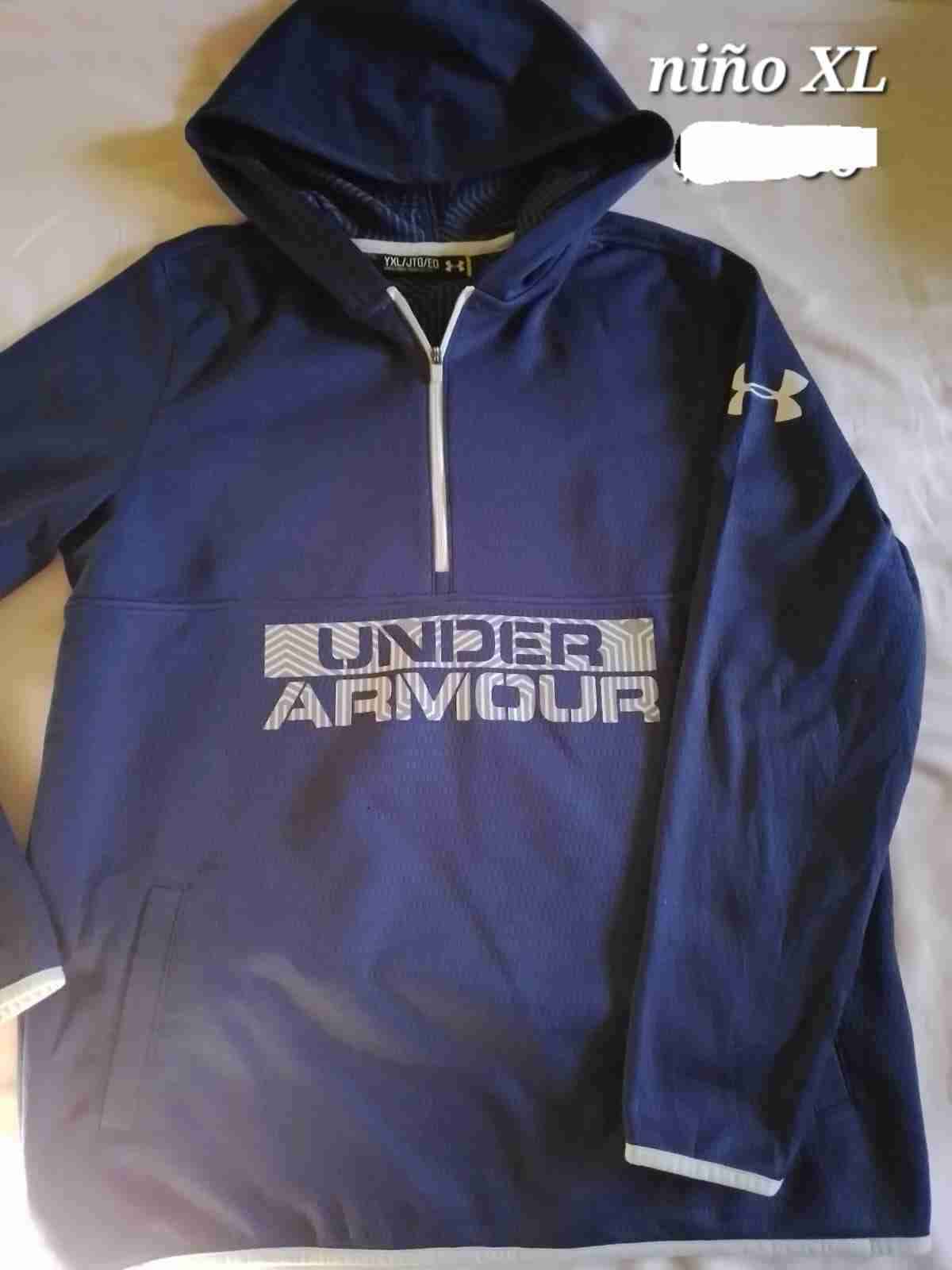 Polerón azul para niño con capucha y cremallera, ideal para días frescos. En buen estado, marca visible. Talla XL niño.