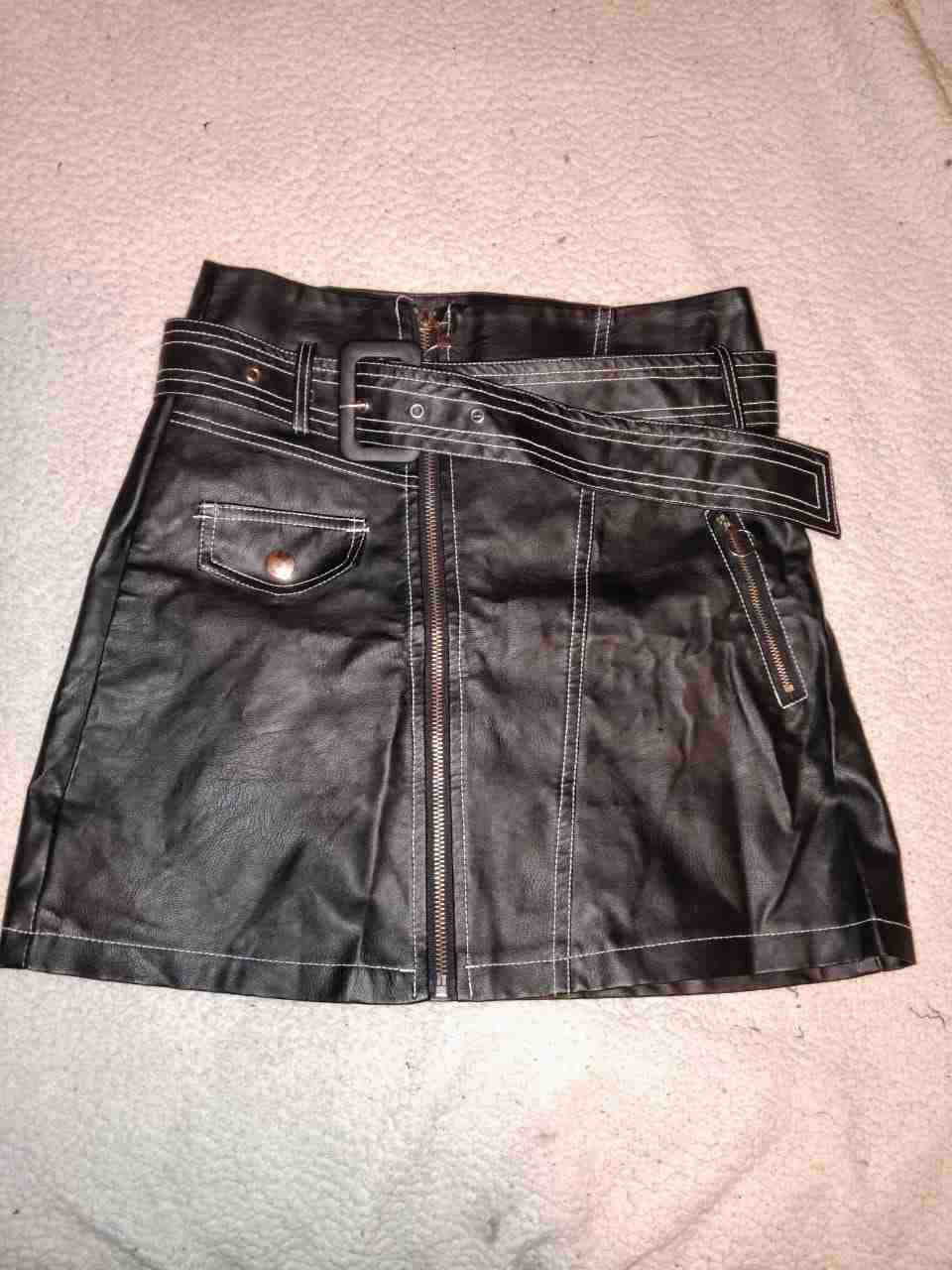 Falda corta negra con cinturón, ideal para salidas casuales. En buen estado, material resistente.