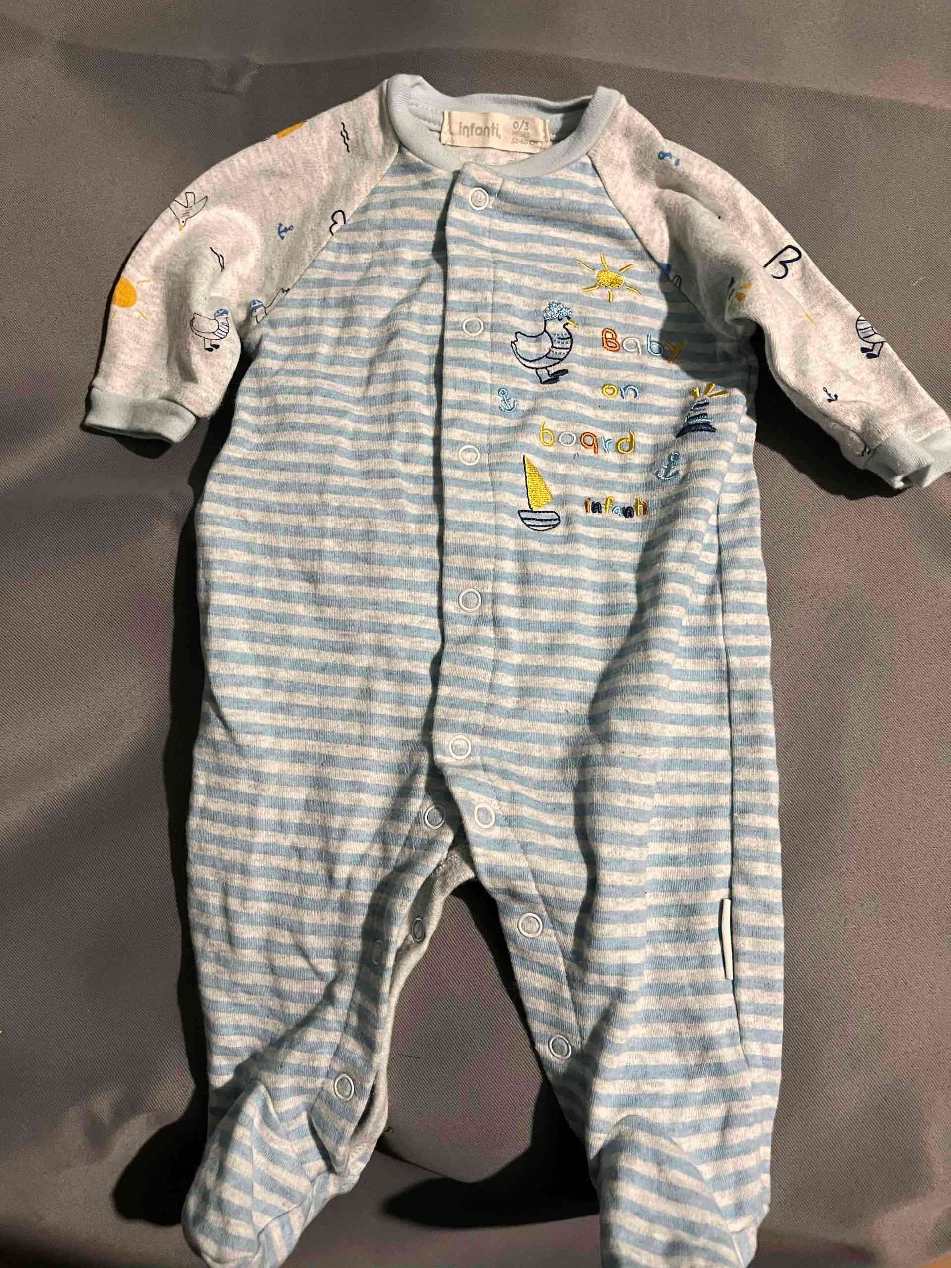 Enterito para bebé con diseño rayado azul y detalles marinos. Perfecto para mantener abrigado al pequeño. En buen estado.