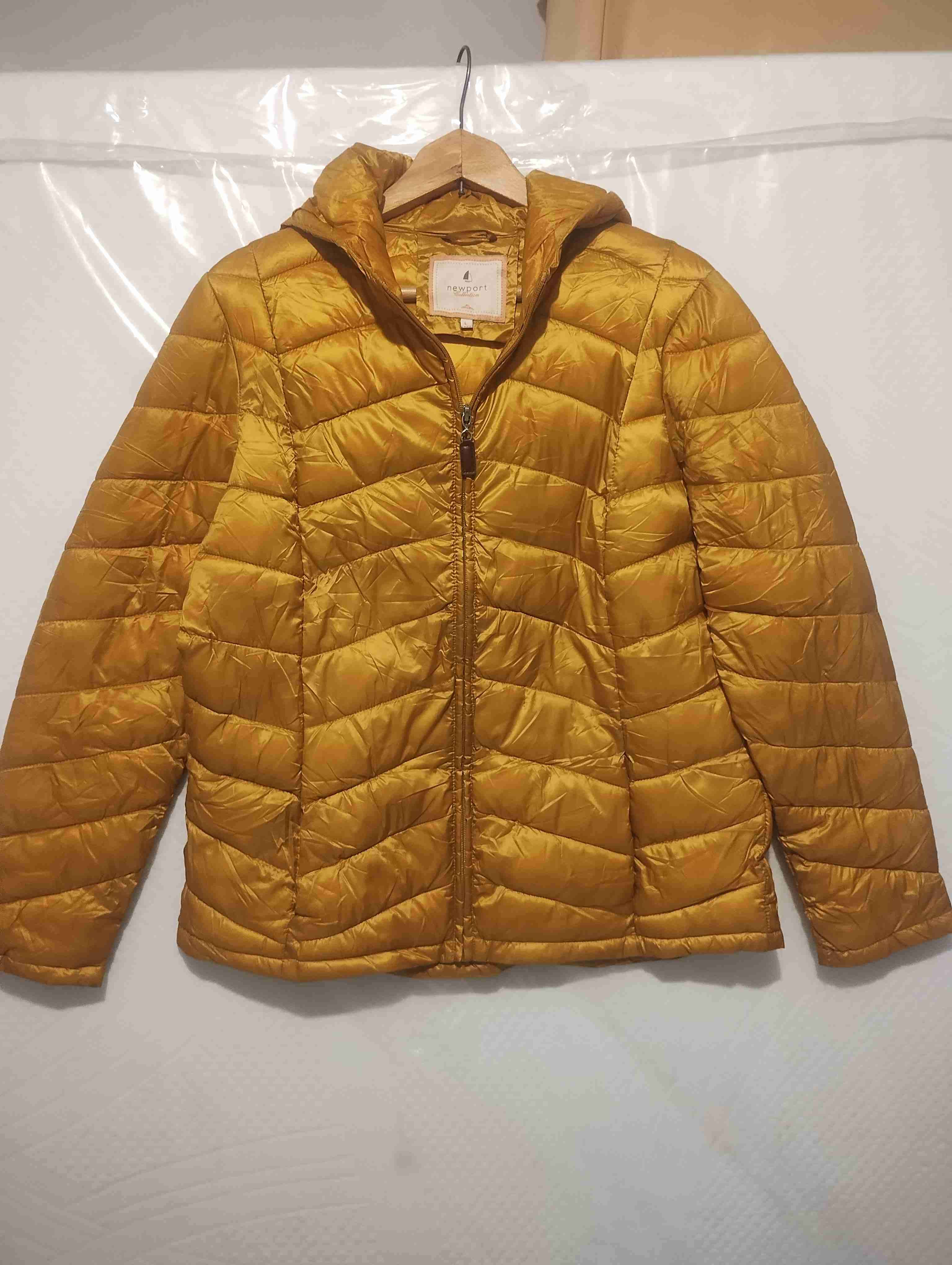 Chaqueta abrigada de color amarillo con cierre y capucha, ideal para el invierno. En buen estado.