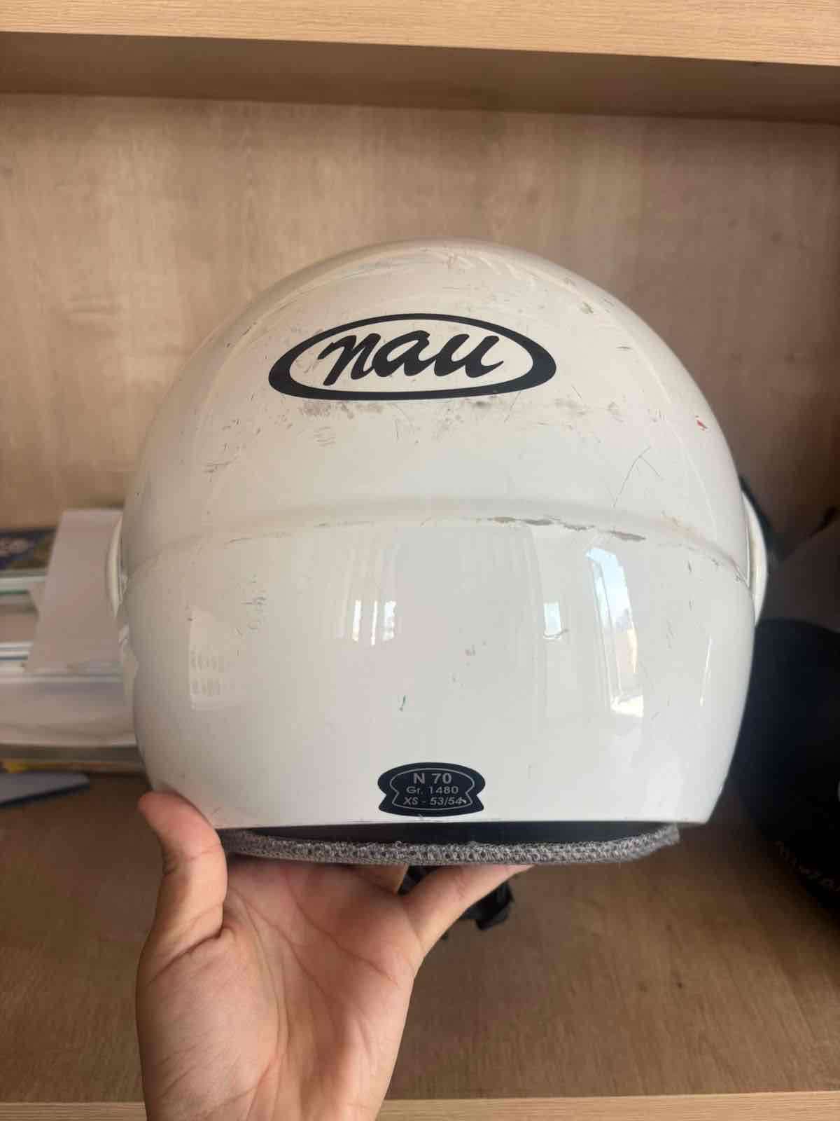 Casco de moto blanco marca Nau con algunas marcas de uso. Ideal para protegerse al andar en moto.