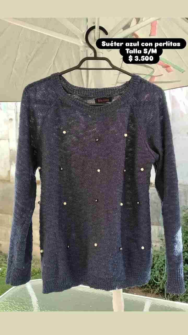 Suéter azul decorado con perlitas, estilo casual y moderno. En buen estado, perfecto para el día a día.