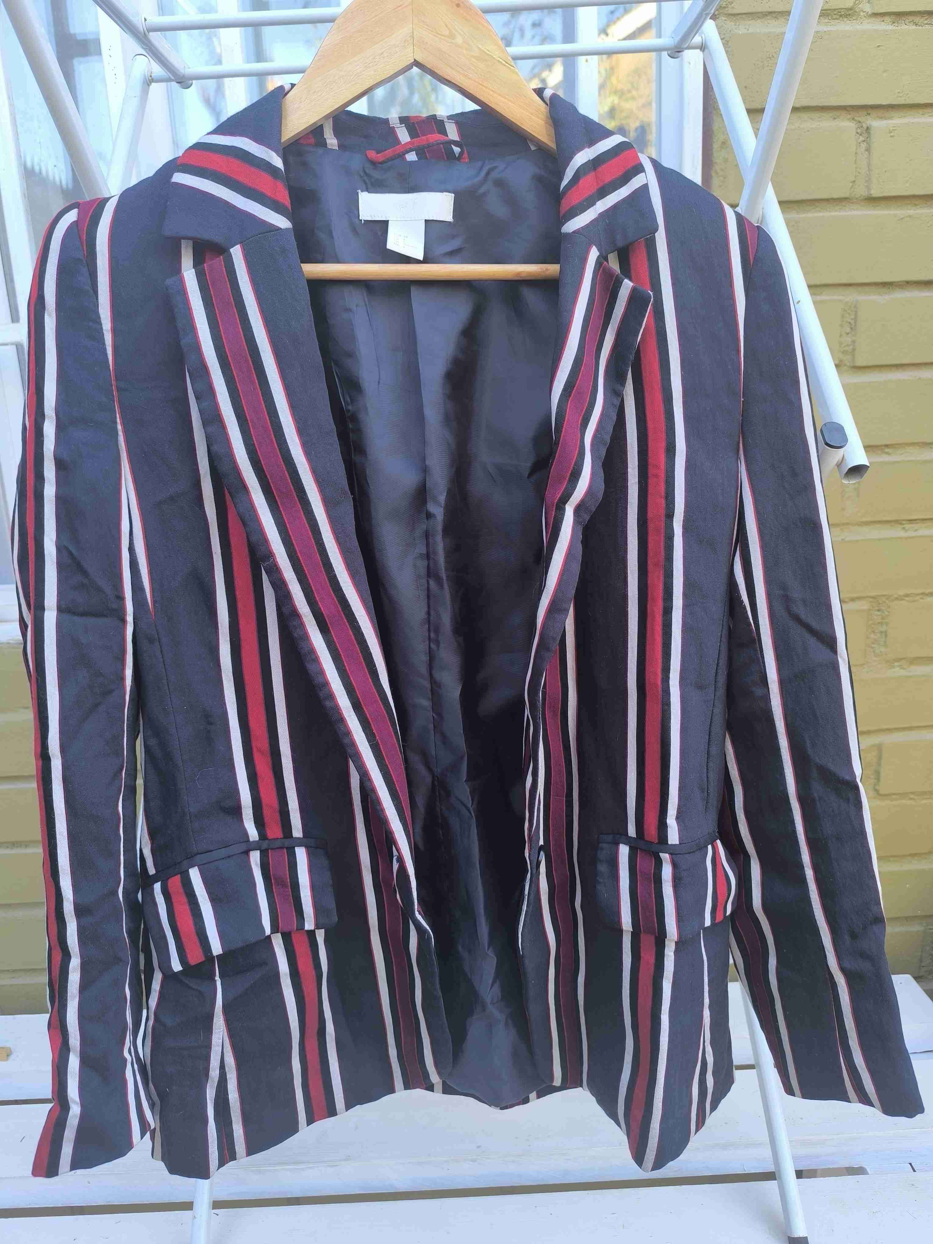 Blazer a rayas en tonos oscuros, ideal para el otoño. En buenos condiciones, con ligero uso visible.