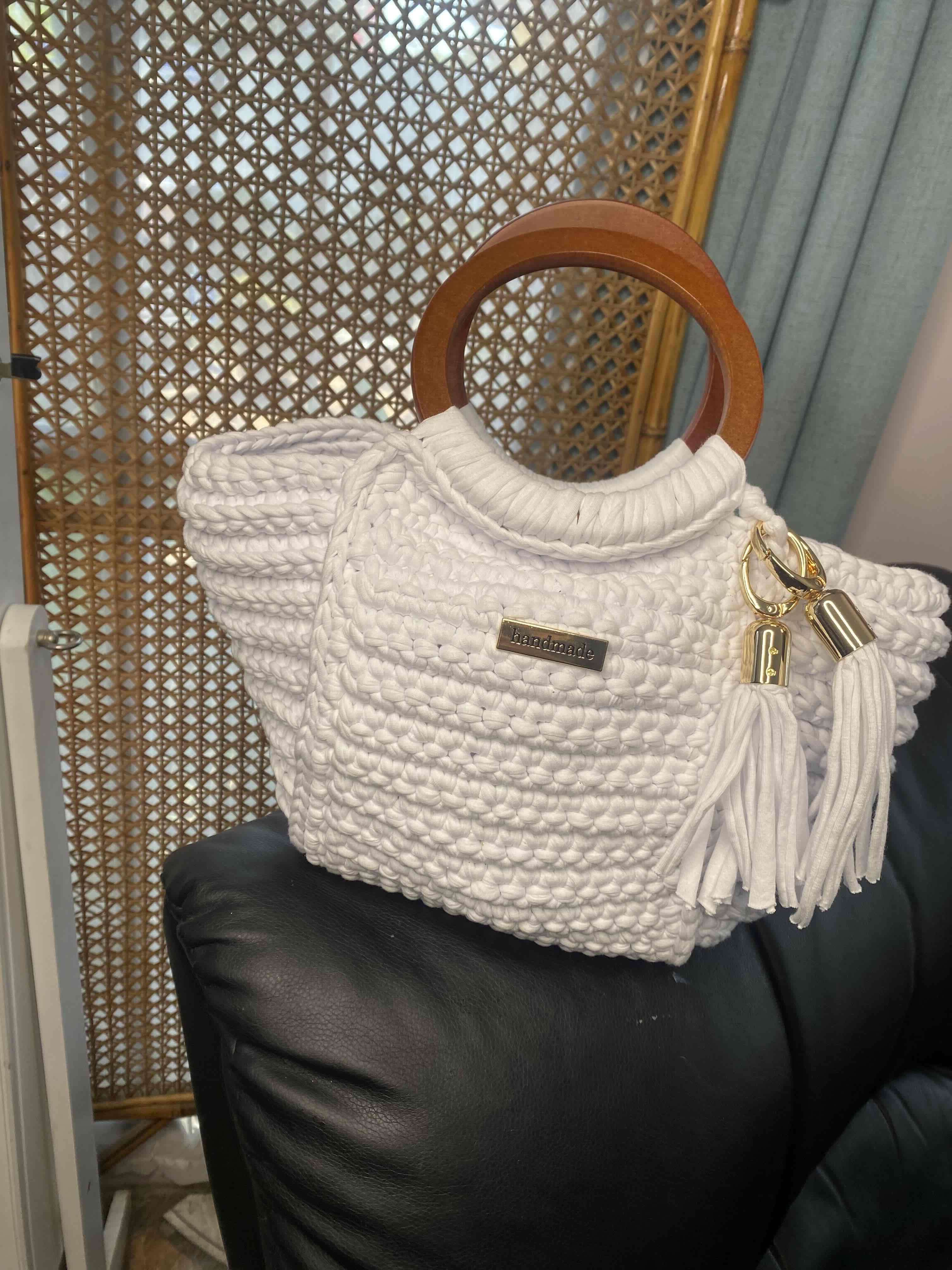 Hermosa cartera tejida a mano en color blanco con elegantes asas de madera. Ideal para un look casual o una salida especial.Este bolso de mano es una pieza Única tejida con la técnica de crochet.