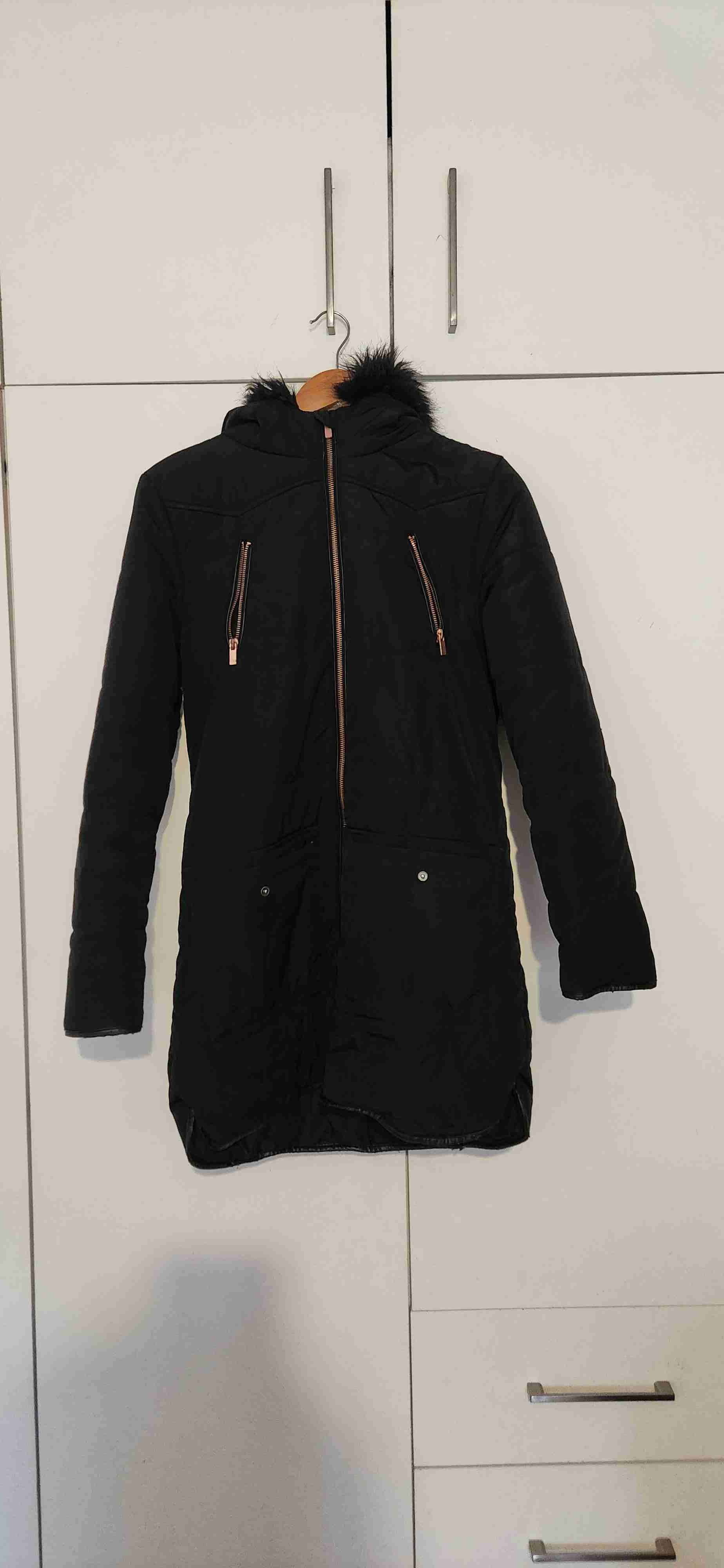 Elegante abrigo negro, ideal para invierno. Capucha con detalle de piel sintética. En buen estado.