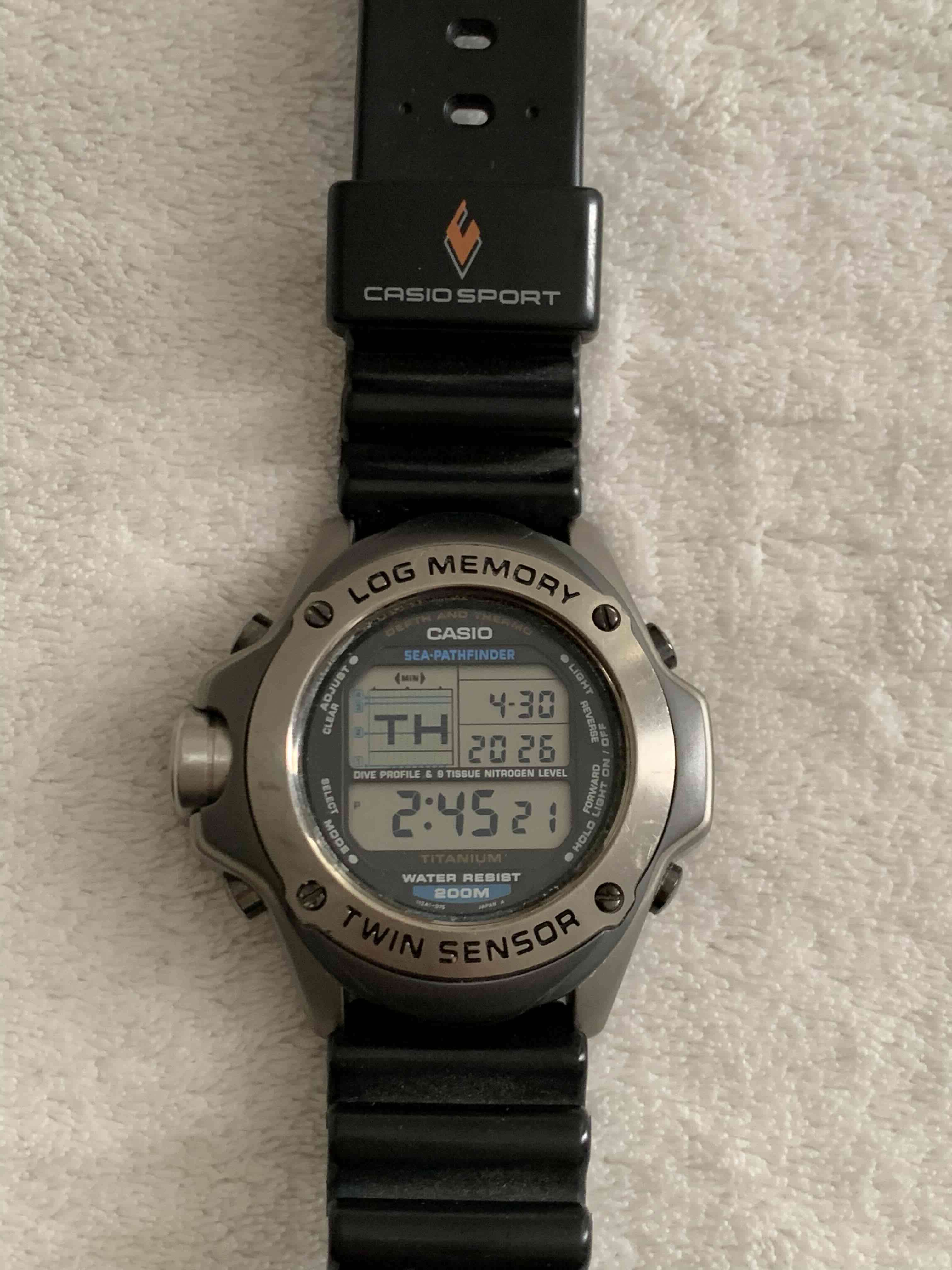 Reloj deportivo digital marca Casio. Modelo SPF-100 S, sea pathfinder titanium Drive sensor de profundidad y temperatura, memoria de registro de buceo, gráfico perfil de buceo, e indicador de nivel de nitrógeno, caja de titanio resistente al agua 200mt En buen estado con signos leves de uso.