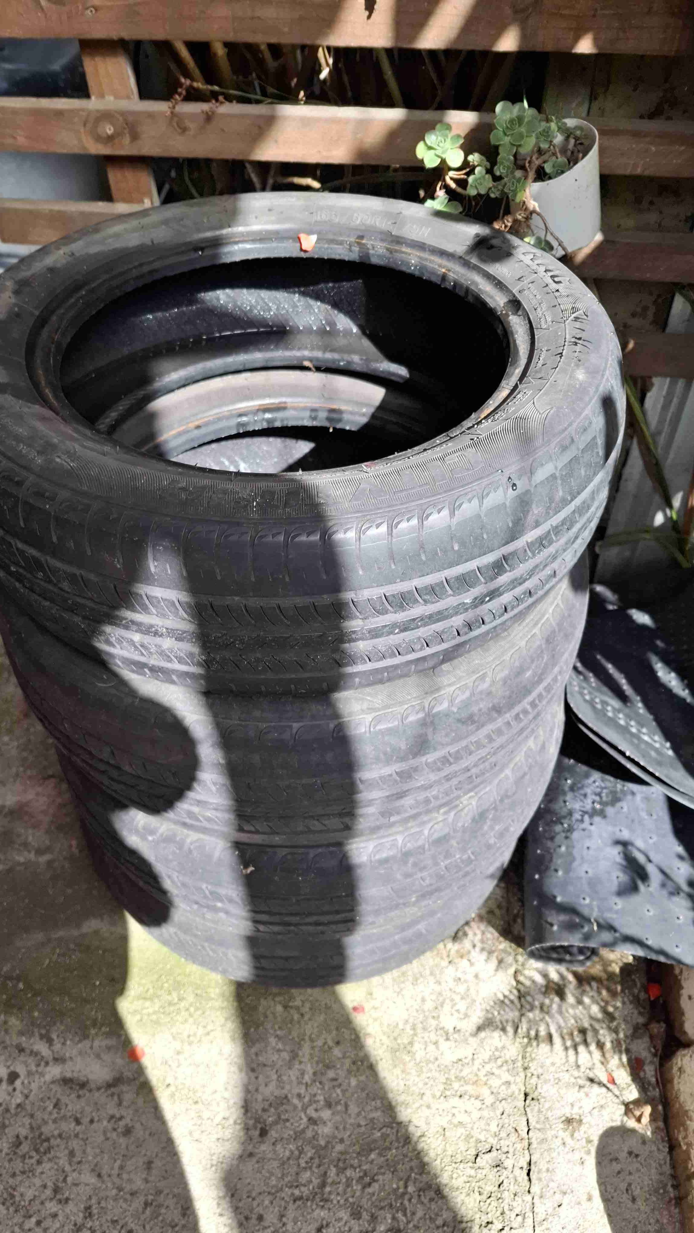 Se venden 4 neumáticos 165/60 R14 por 15.000 Y tina de baño por 20000. Neumáticos en buen estado general, perfectos para repuestos o proyectos de bricolaje. Muestran signos de uso pero funcionales.