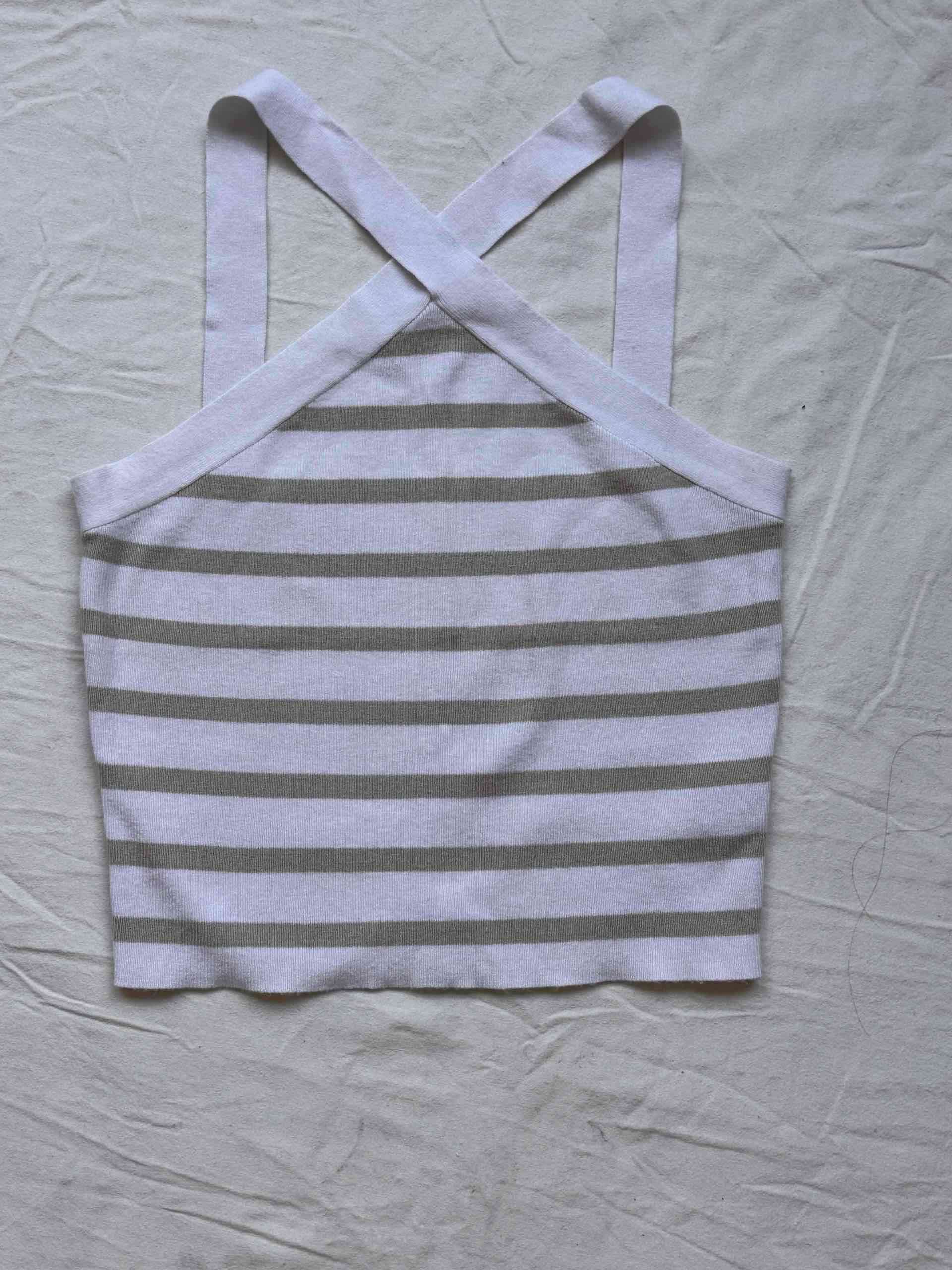 Top estilo casual con diseño de rayas y tirantes cruzados. Ideal para un look relajado.