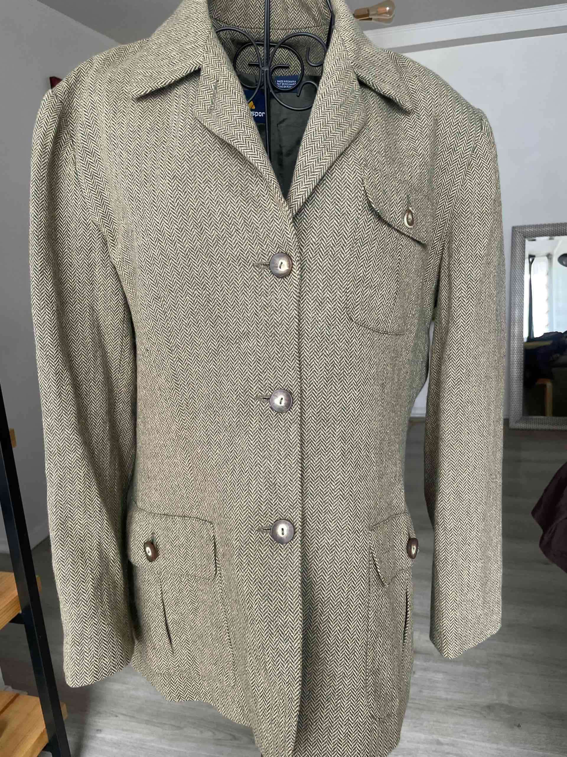 Elegante blazer de lana con patrón de espiga, ideal para un look formal o casual. Excelente estado, con botones y bolsillos funcionales.
