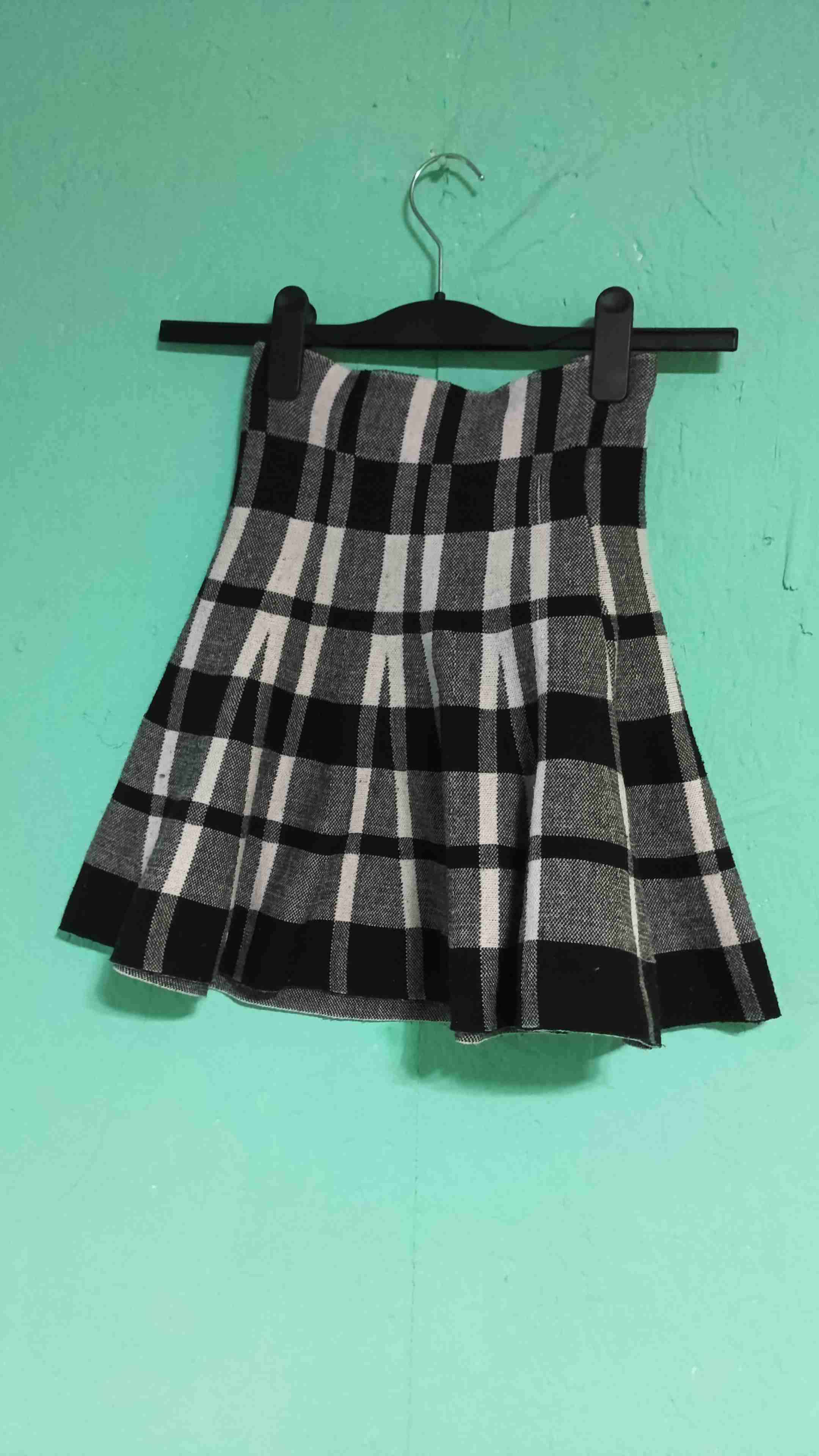 Falda corta con patrón de cuadros negros y grises. Ideal para un look casual. En buen estado con leves signos de uso.