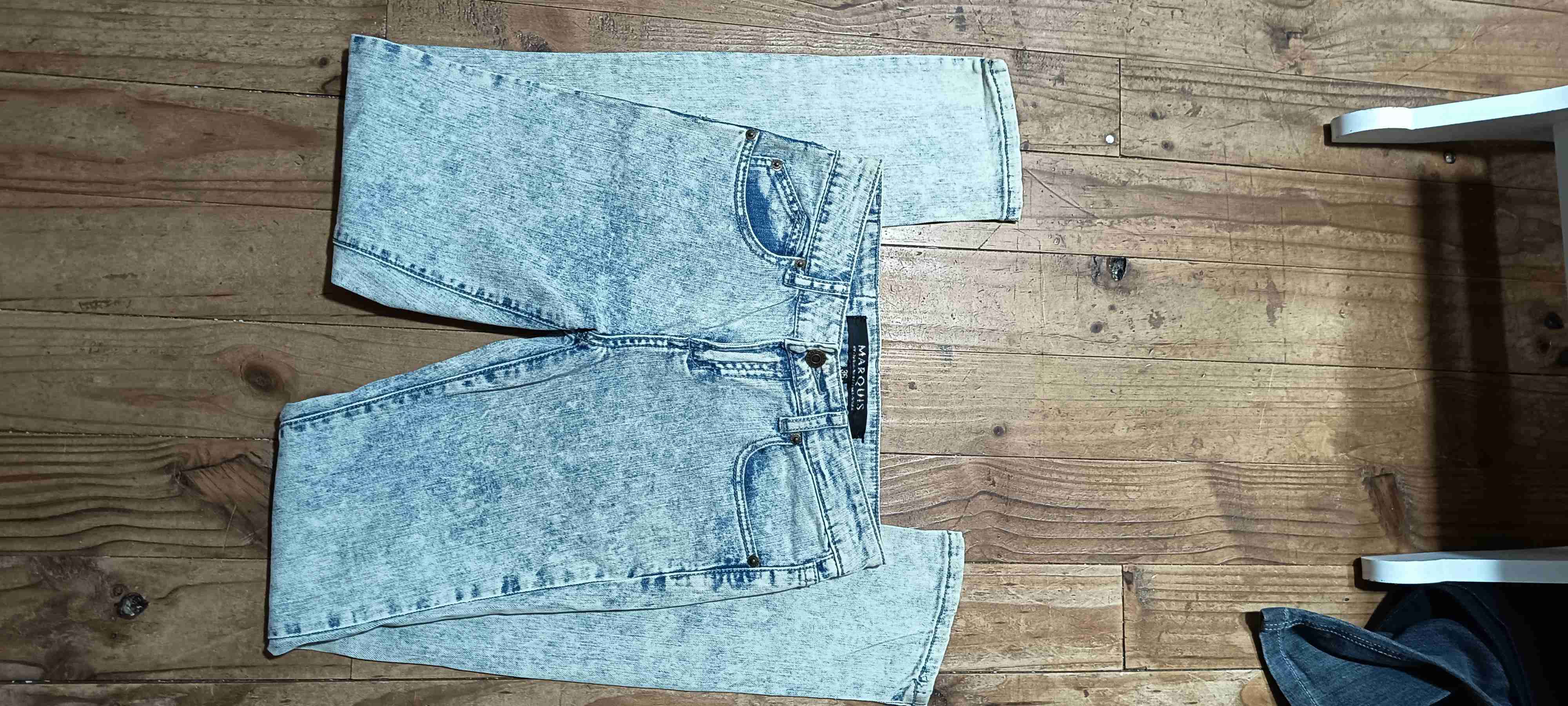 Jeans de corte moderno y color celeste desgastado. Ideales para un look casual diario. En buen estado con señales leves de uso.