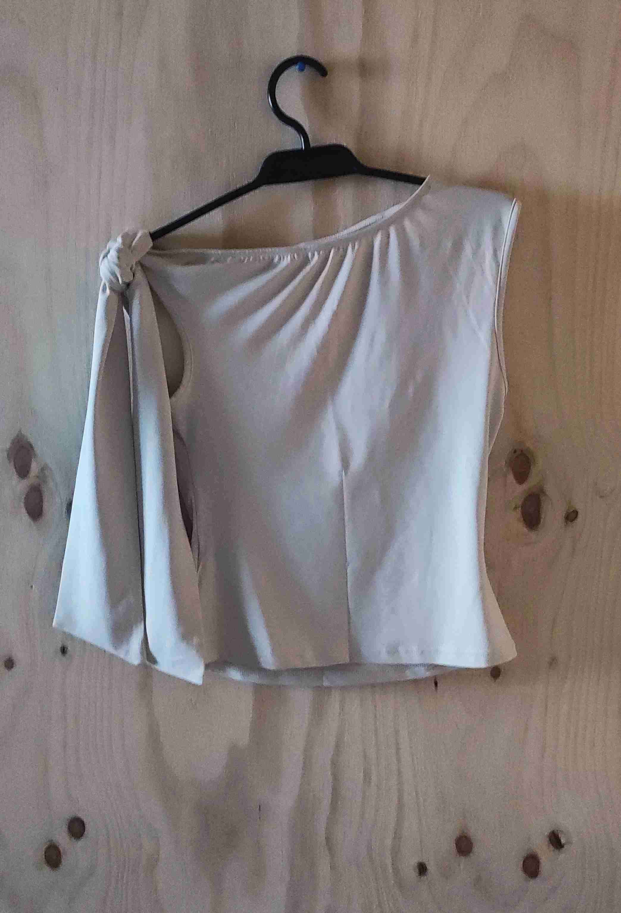 Elegante top beige con detalle de nudo en el hombro, ideal para salidas casuales. Marca Shein. Talla S.