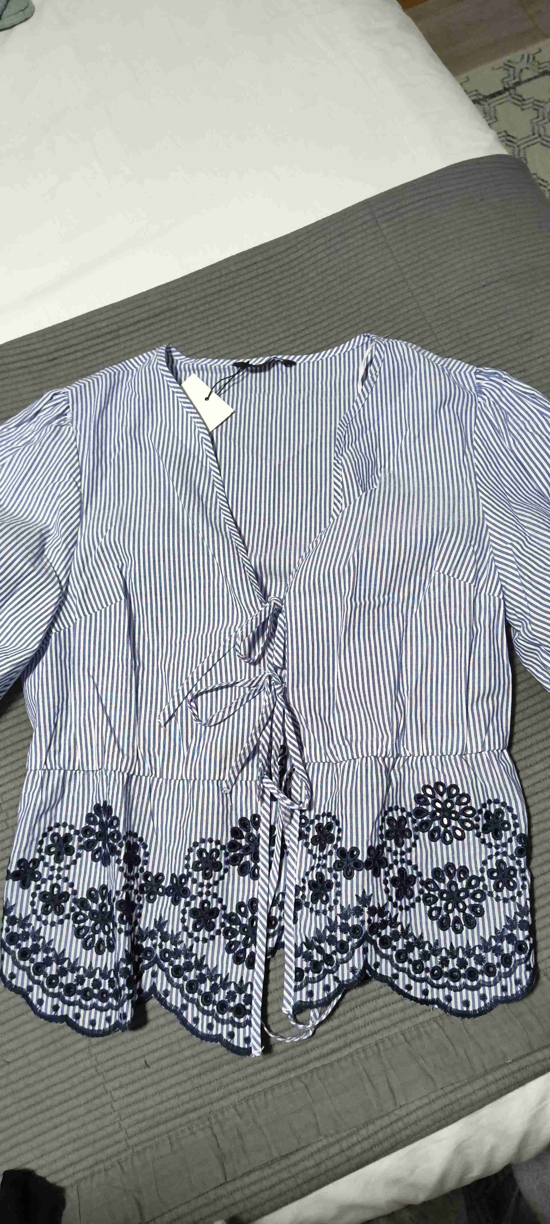 Hermosa blusa con rayas y detalles de encaje azul, ideal para un look casual. En buen estado.