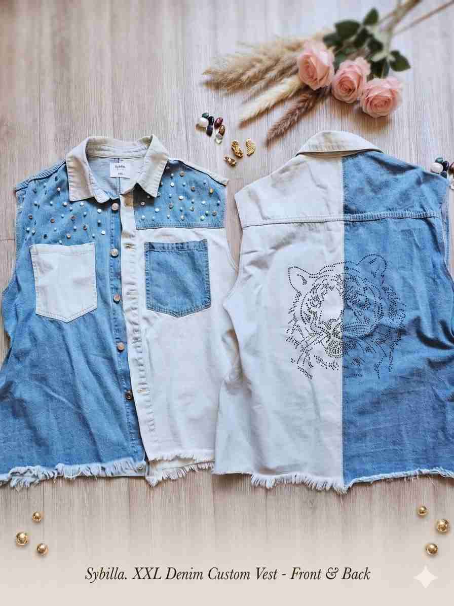 Chaleco sin mangas de mezclilla con tachas y diseño de tigre en la espalda. Buen estado, estilo único y casual.