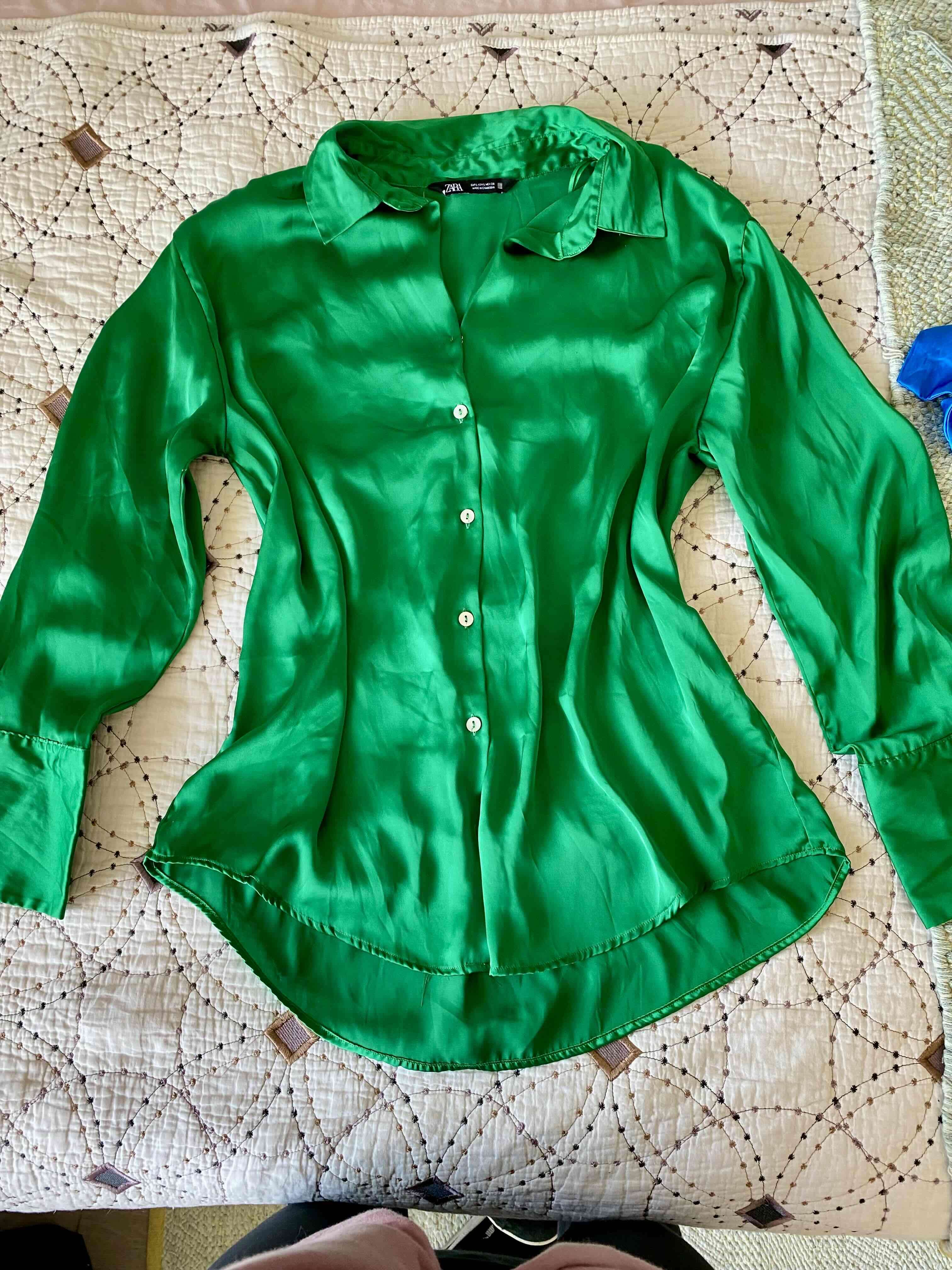 Elegante blusa verde de satén, ideal para ocasiones especiales. En buen estado.