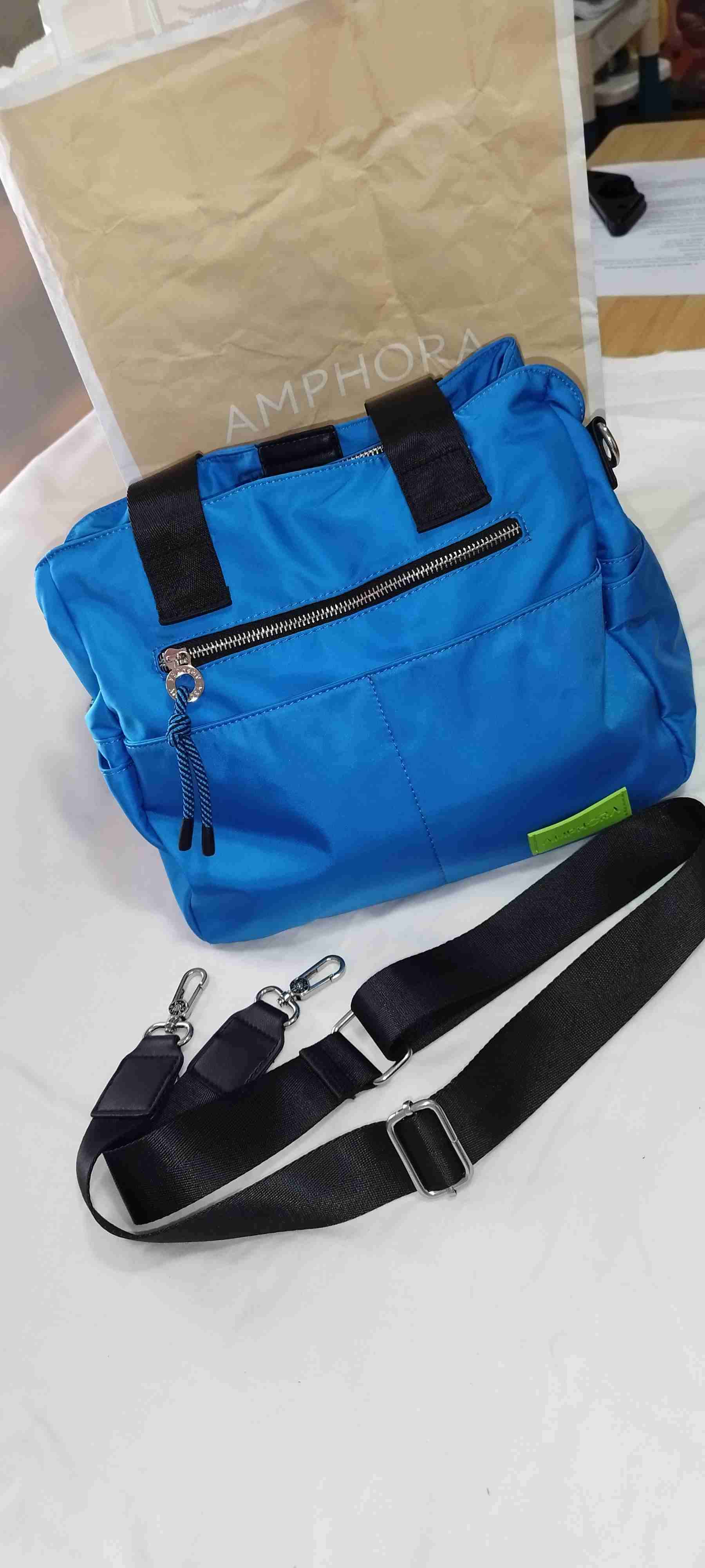 Bolso azul con diseño moderno y correa ajustable. Ideal para el día a día. En buen estado.