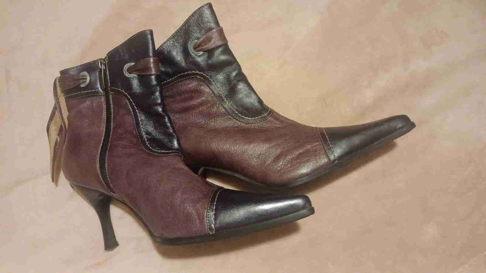 Elegantes botines de cuero en tonos marrón y negro, ideales para el otoño. En buen estado general con uso leve visible.