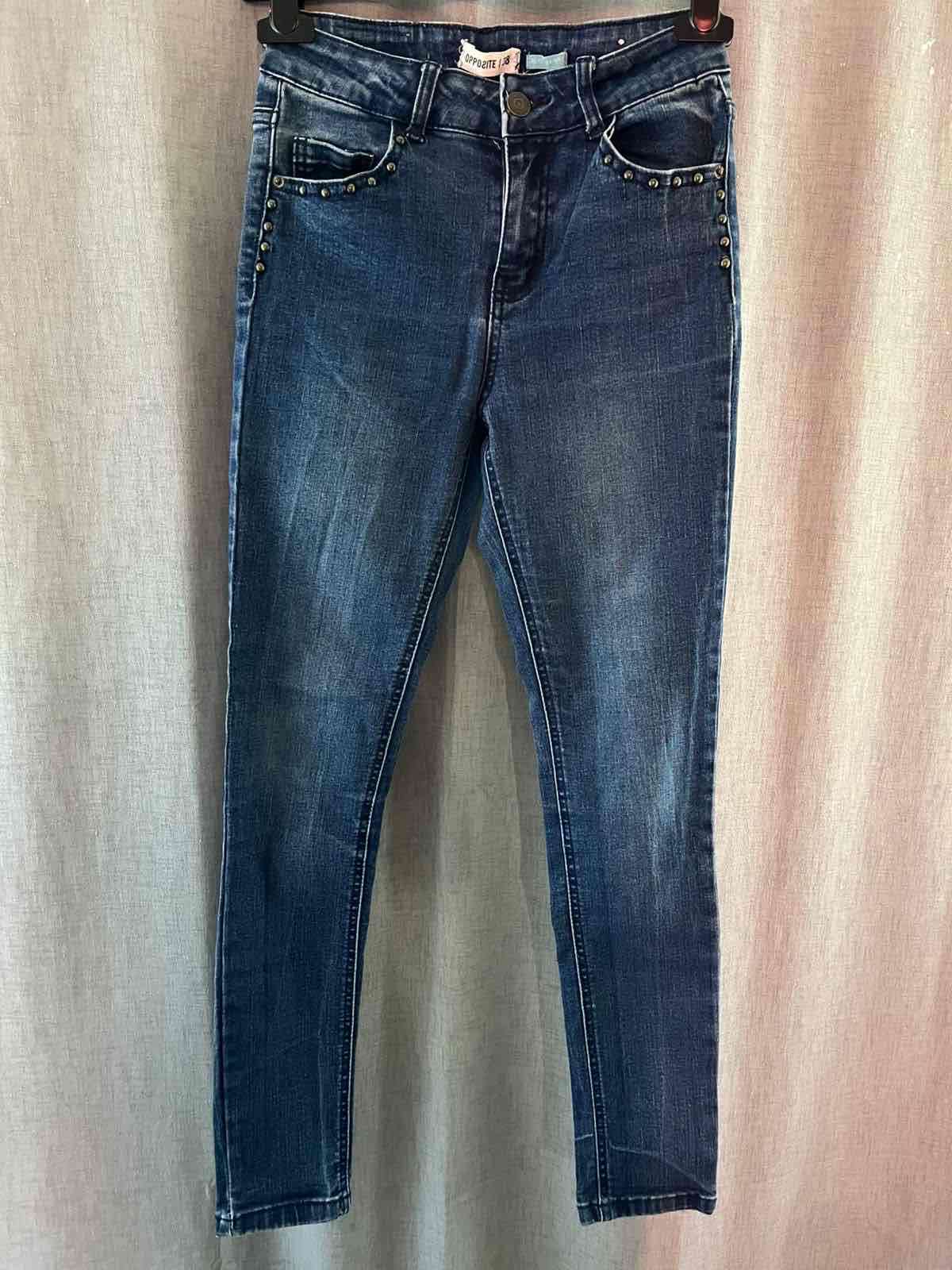 Jeans de mezclilla azul con detalles de tachas. Perfectos para un look casual. En buen estado general.
