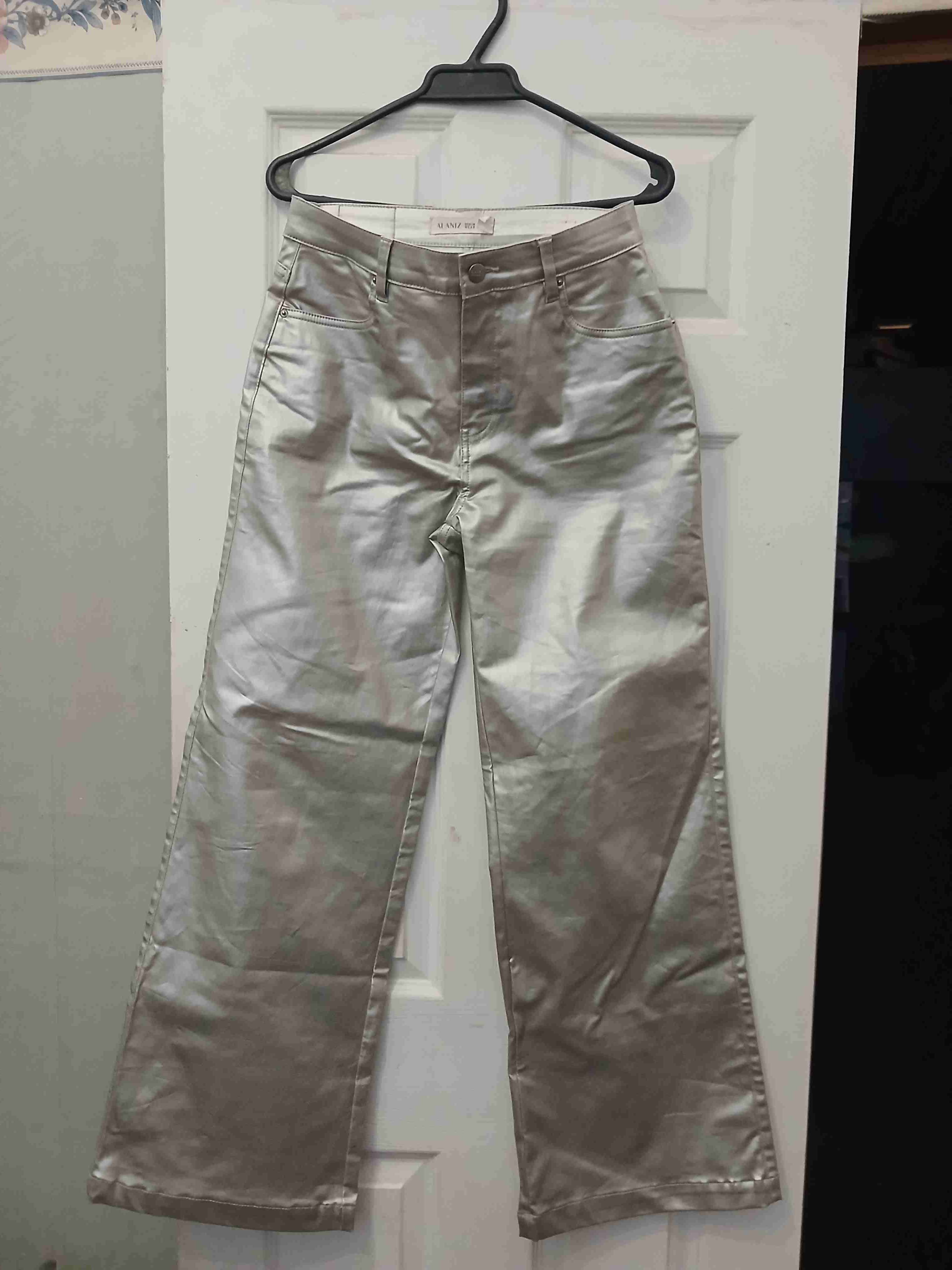 Pantalones de color plata con un acabado brillante, ideal para salidas nocturnas. En buen estado general.