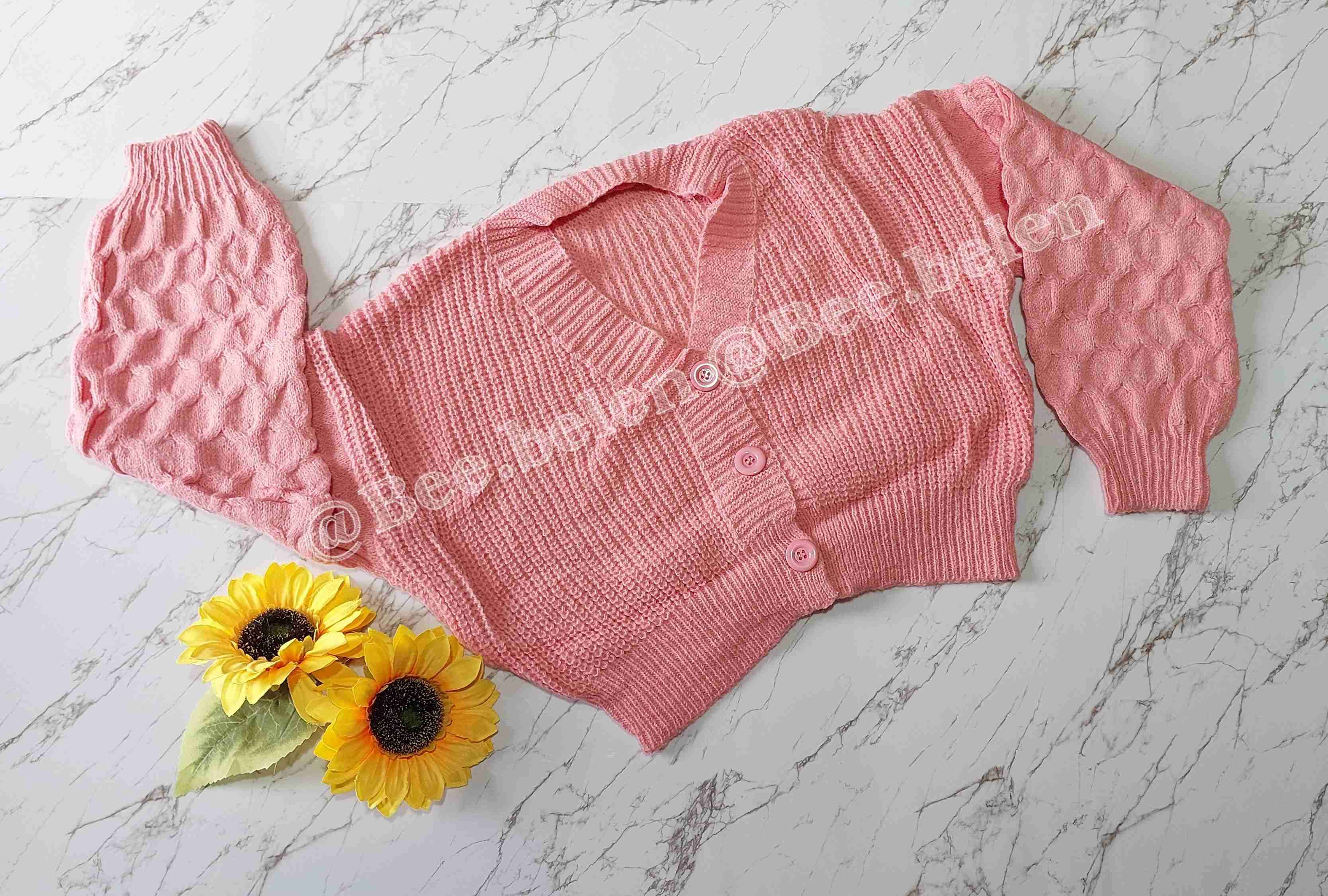 Cardigan rosado de punto grueso, estilo casual con mangas abullonadas. Ideal para días frescos, talla estandar que abarca hasta la xl