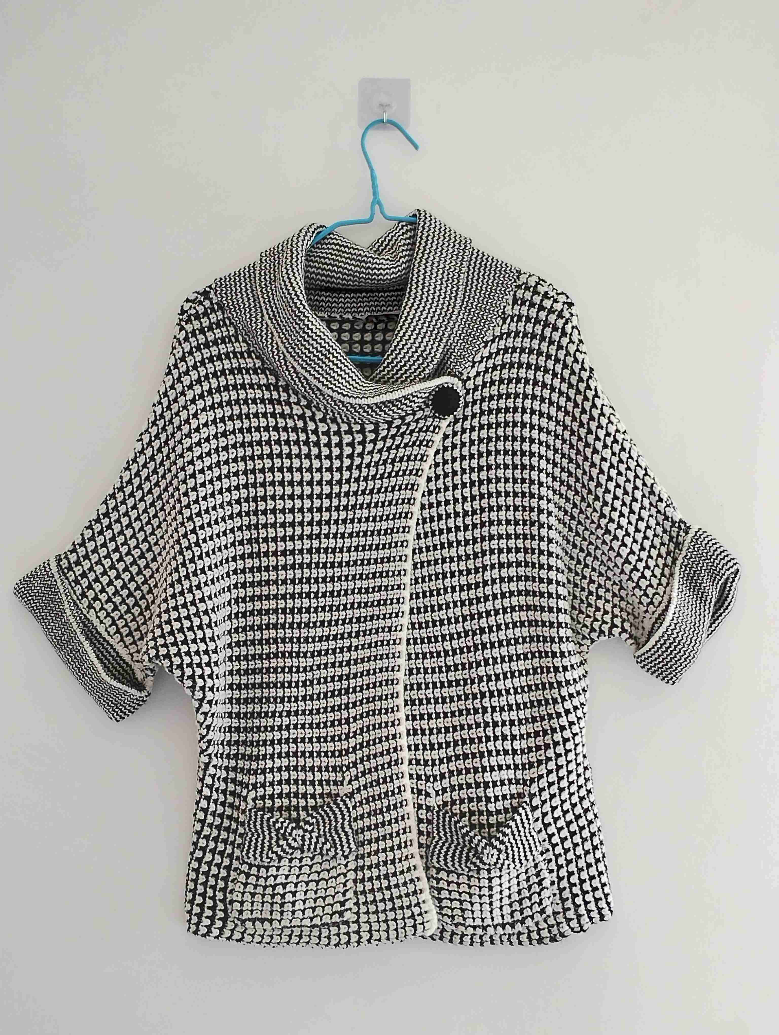 Elegante chaleco de punto con diseño blanco y negro, perfecto para días fríos. En buen estado, con cierre frontal y botón decorativo.La talla puede aplicar para M y L.