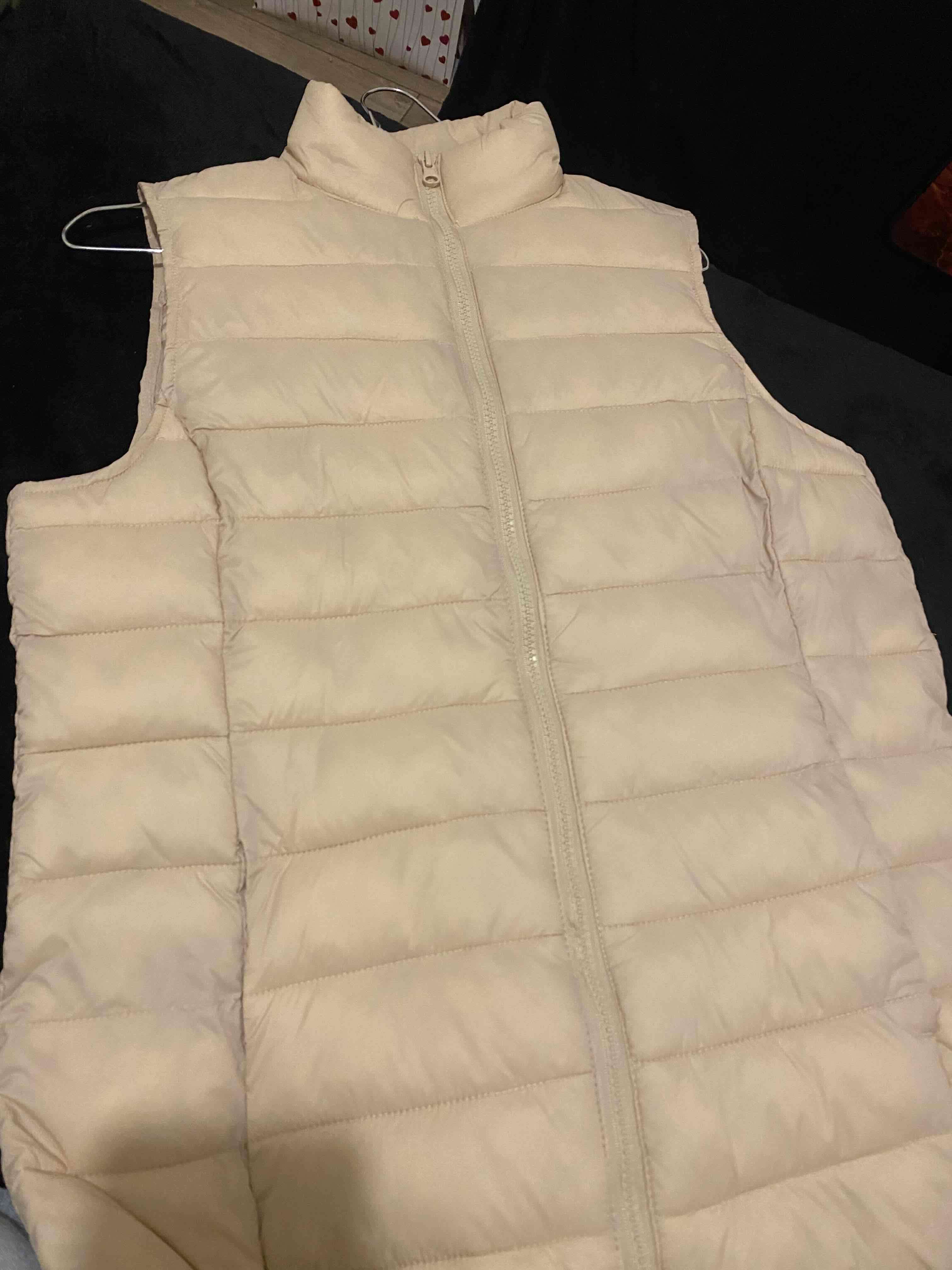 Chaleco sin mangas en color beige, ideal para el invierno. En buen estado, con cierre frontal.