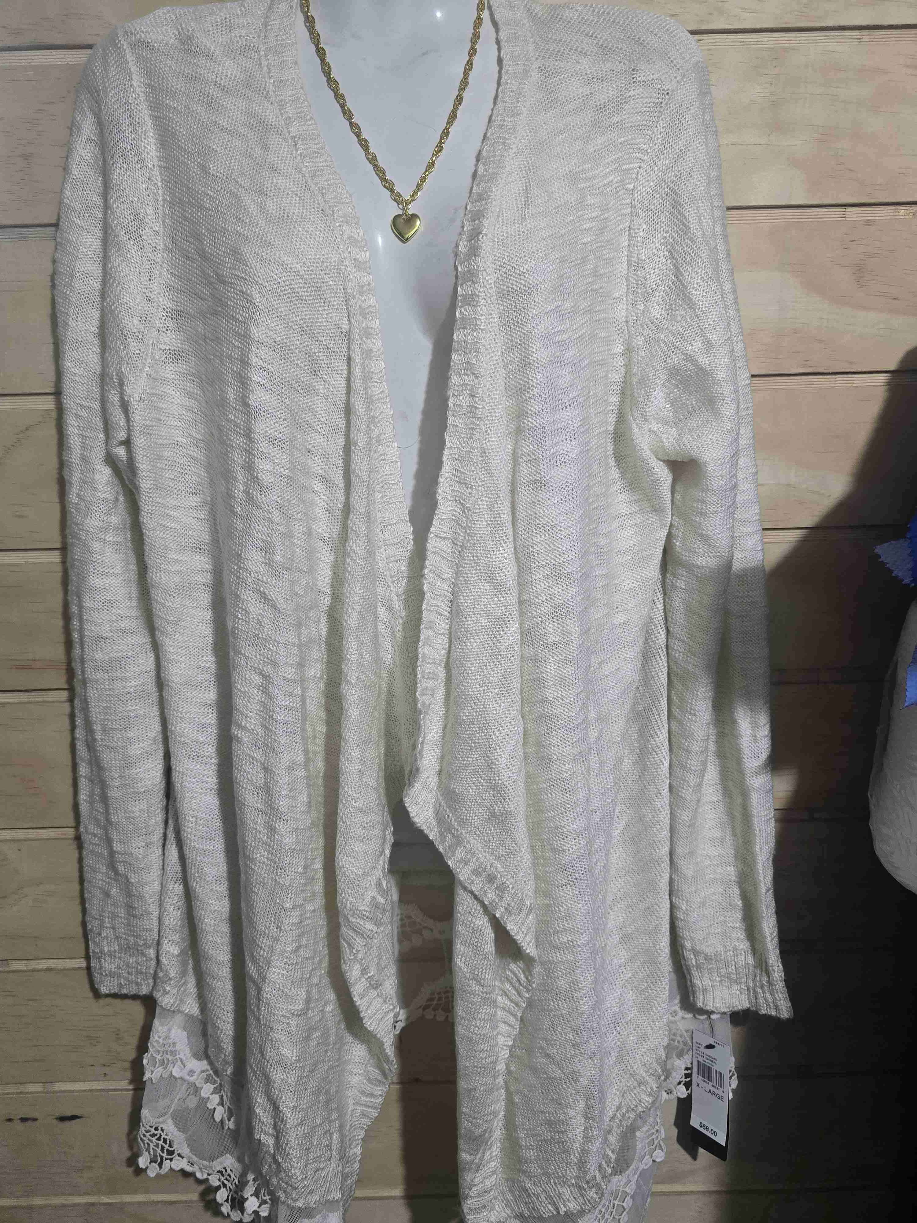 Cárdigan ligero blanco con detalles de encaje en el borde. Ideal para un look casual y femenino. En excelente estado, apenas utilizado.
