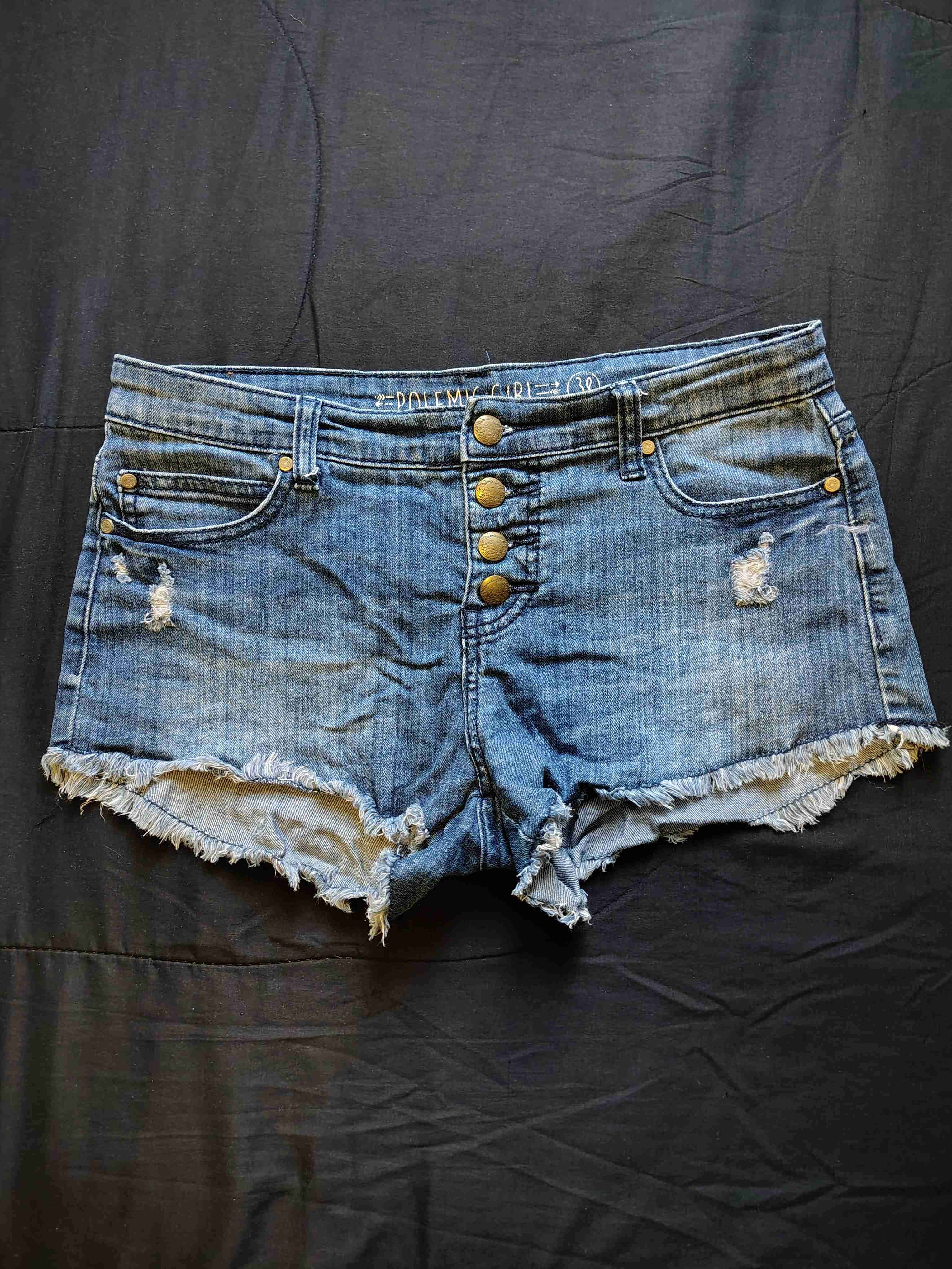 Shorts de mezclilla azul con botones frontales y bordes deshilachados. Ideal para un look casual veraniego.