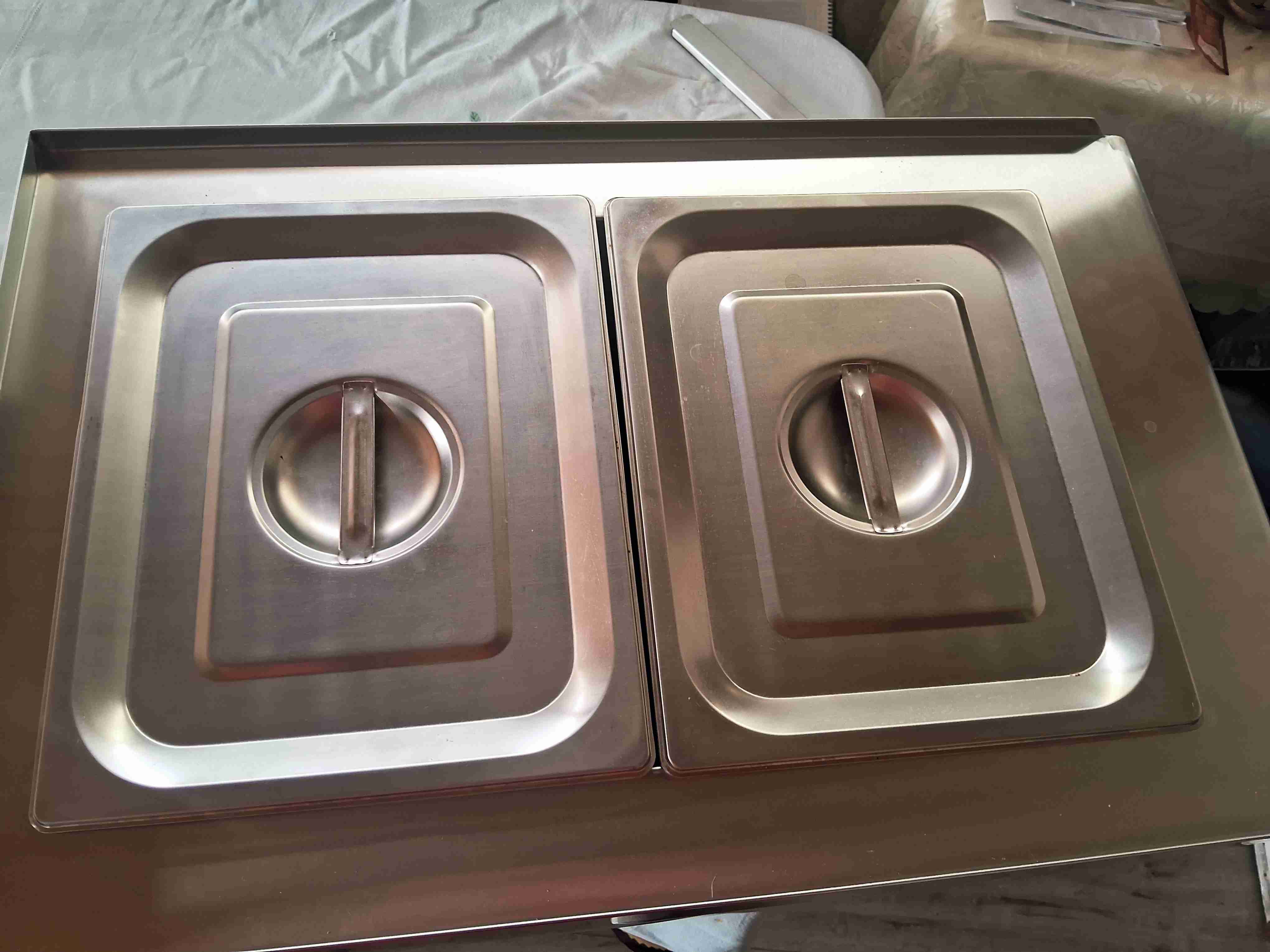 Bandejas de acero inoxidable en buen estado, ideales para cocina profesional. Tapa con asa para fácil manejo.