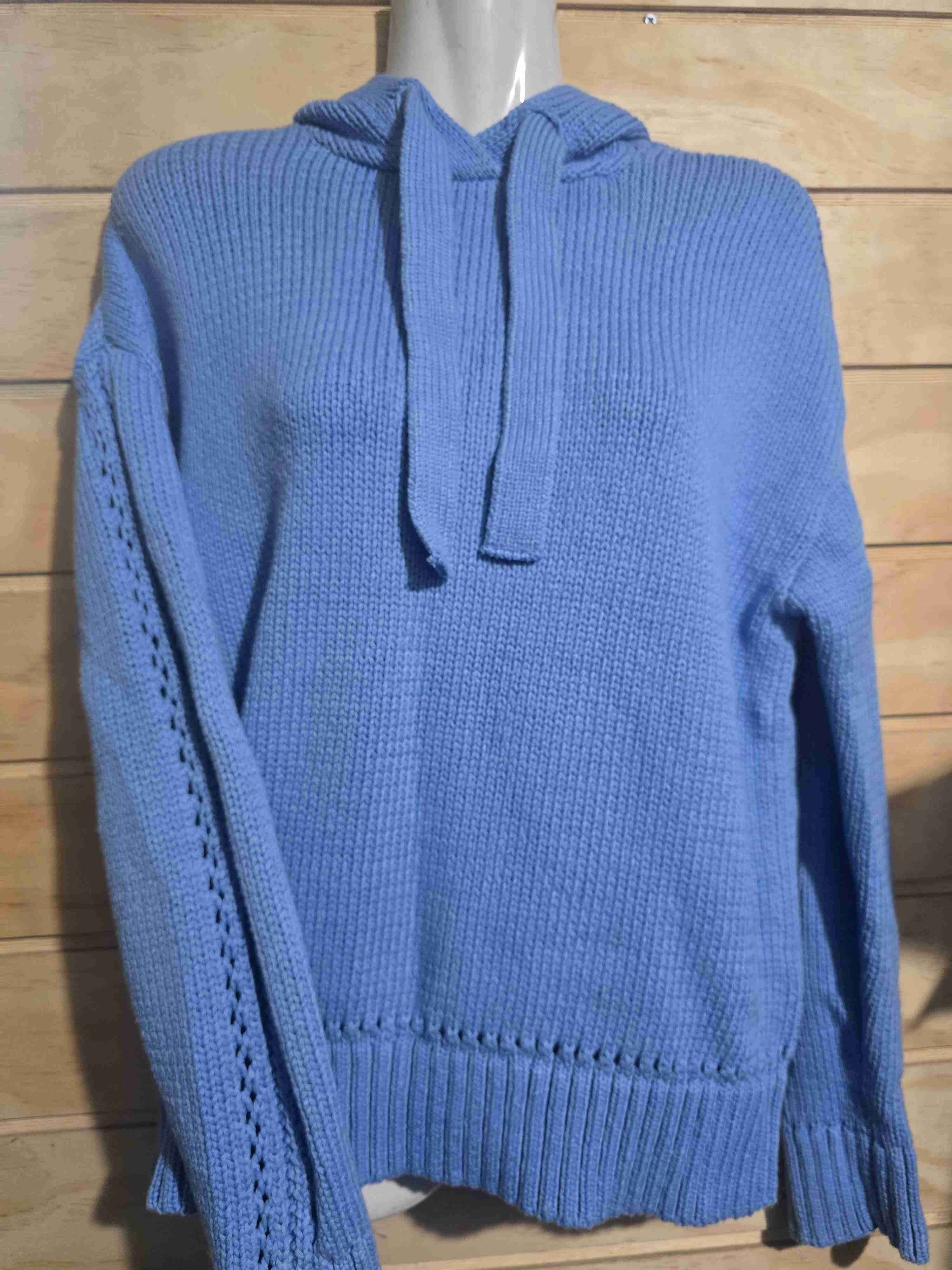 Polerón de lana con capucha, color azul claro. Perfecto para días frescos, en buen estado. Tejido precioso modelo