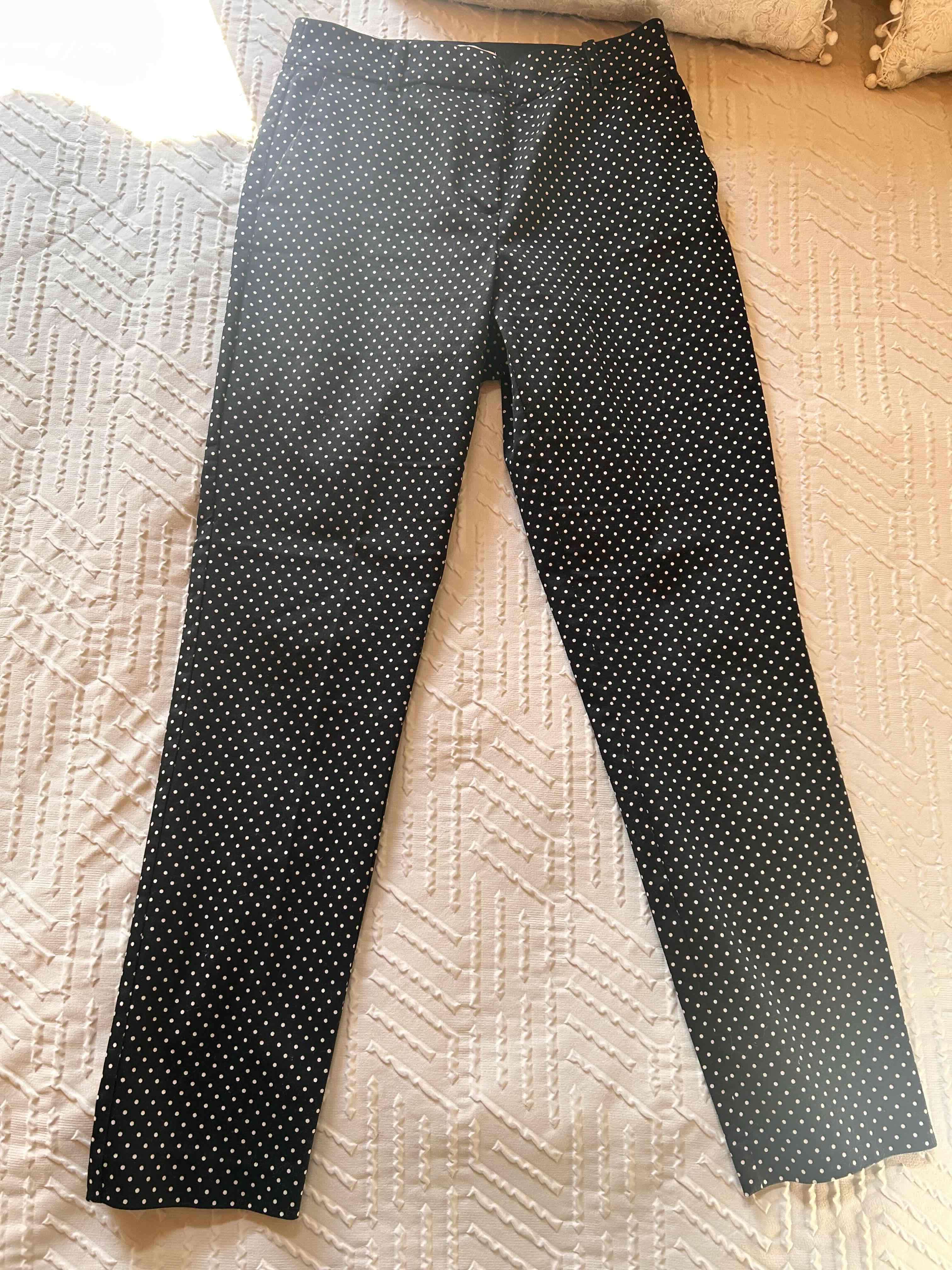 Pantalones de tela negra con lunares blancos. En buen estado y estilo oficina, perfectos para el día a día.