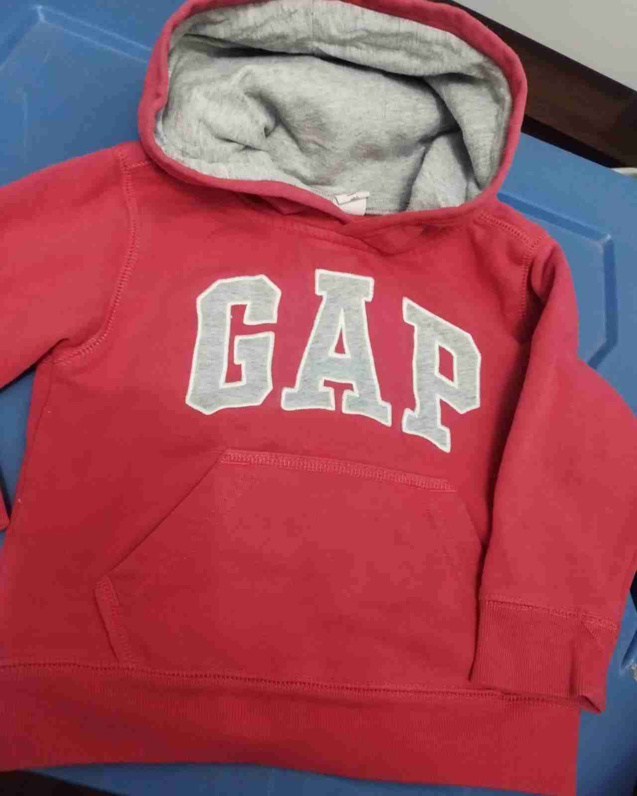 Polerón rojo con capucha y logo GAP en el frente. Ideal para días frescos. Buen estado.